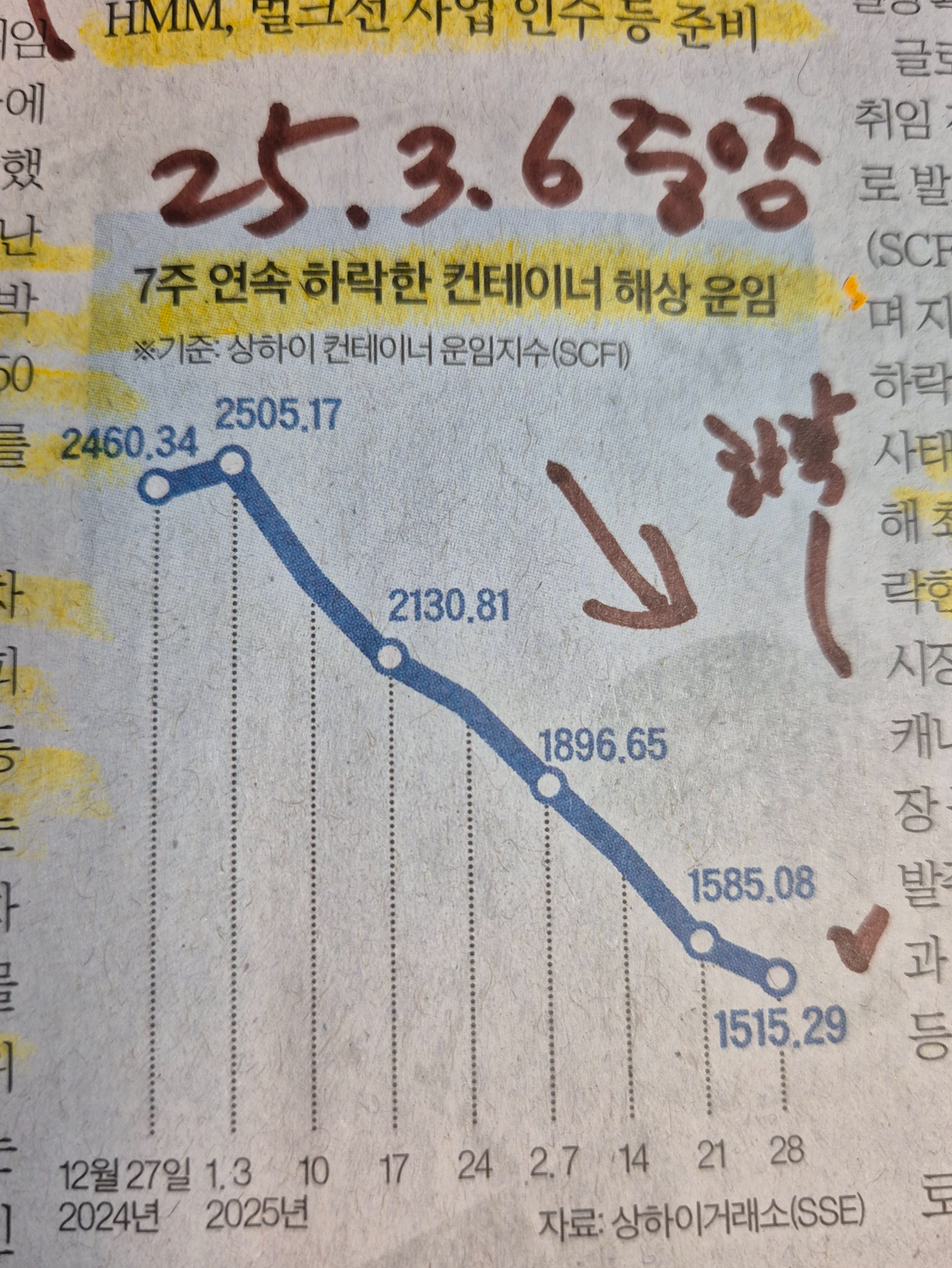 -코로나 시기의 해상 컨테이너 지수의 폭등, 전쟁을 비롯한 해상의 변수로 인한 컨테이너 지수의 재폭등. 많은 사유로 컨테이너의 운임지수의 높은 운임 상황이 유지되고 있었다. 하지만 24년 말을 기점으로 운임 지수는 하락 중이다.