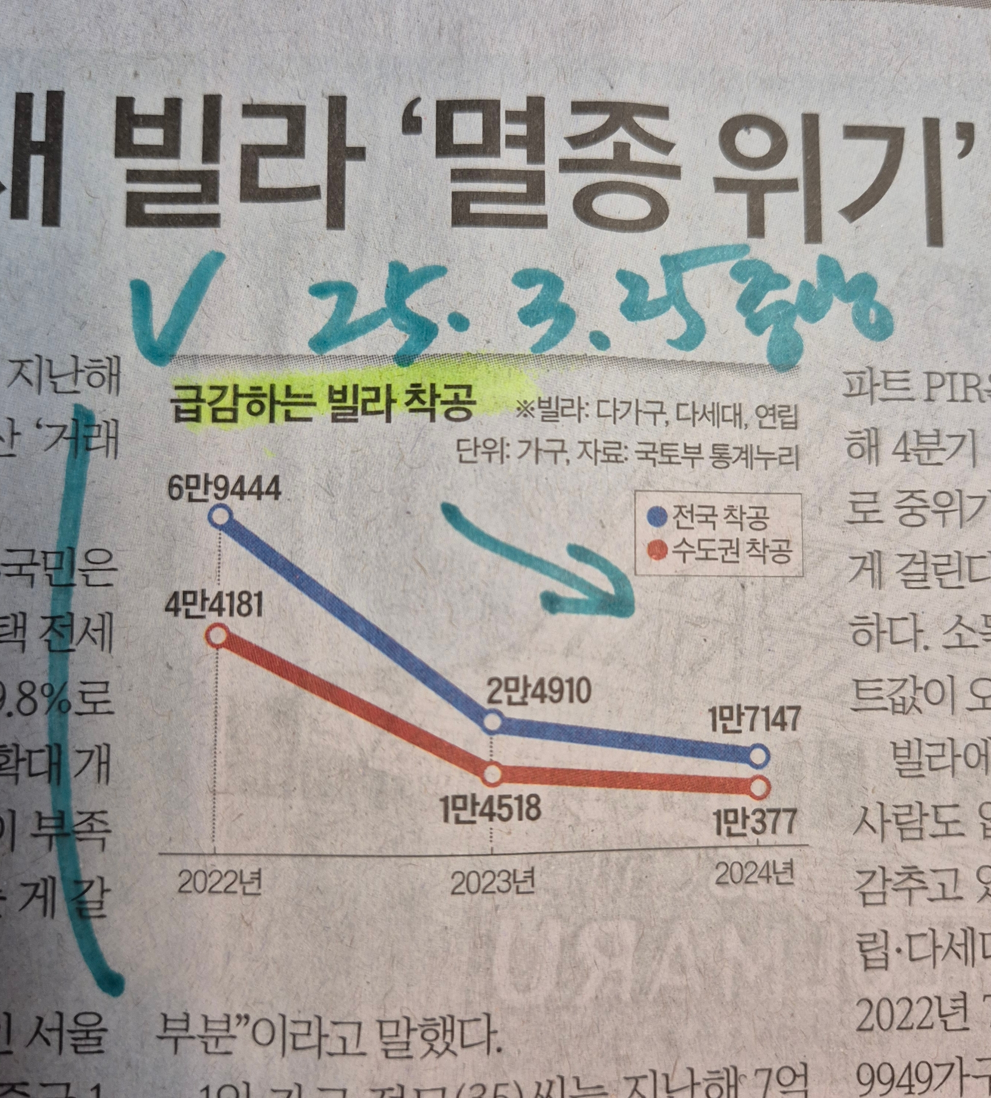 -빌라의 착공은 2022년 전세사기 이후로 위험성이 화두가되어 2년만에 전국적으로는 1/6토막 수도권의 경우 1/4토막으로 줄어들었다.