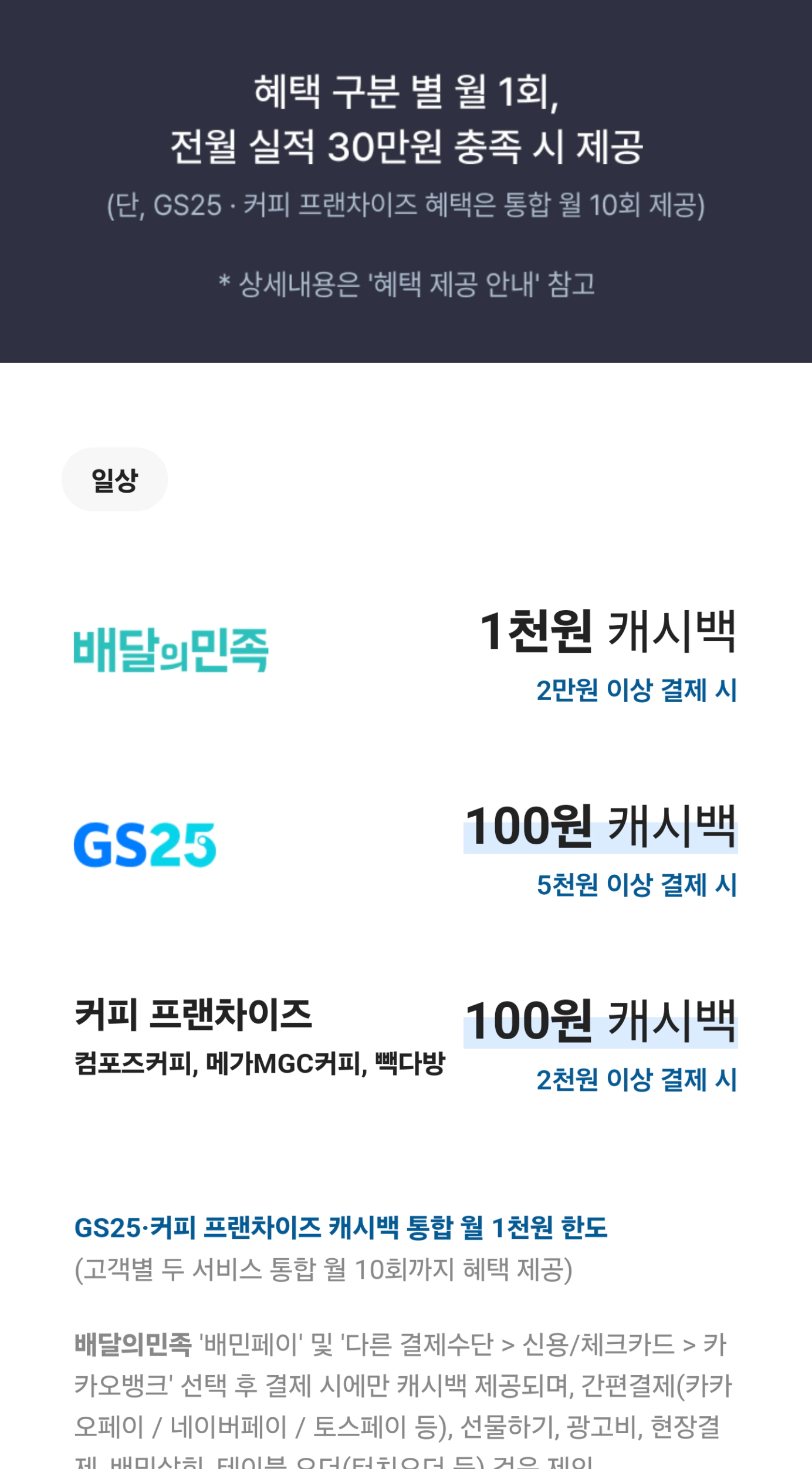 하지만 자주 사용하는 메가커피나 컴포즈 커피에 대한 2천 원 이상 결제 시 100원 캐시백 혜택이 있다.