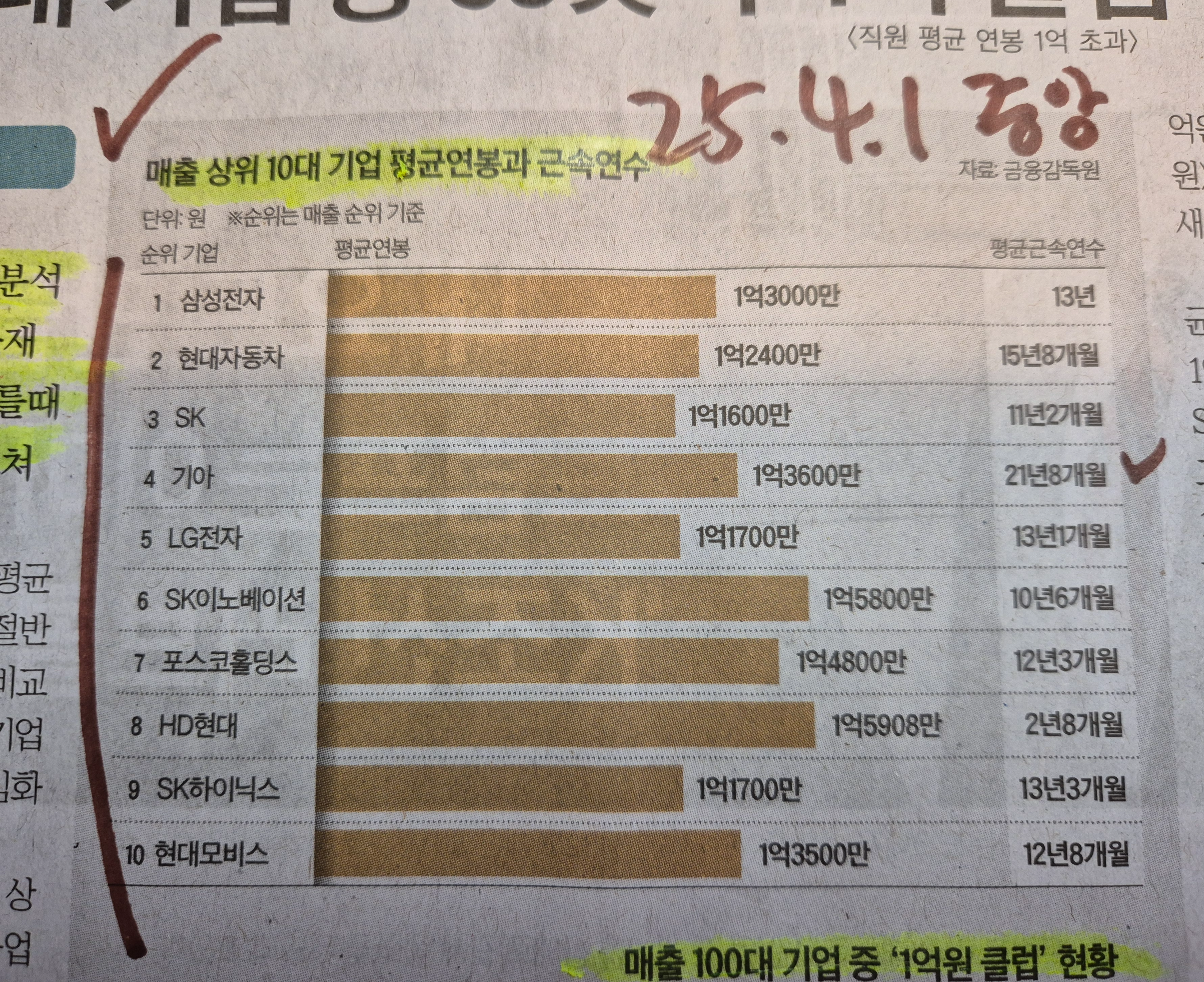 -눈에 띄는 것은 규모는 삼성이 가장 크지만 연봉의 탑은 HD현대가 1위라는 점과 역으로 근속연수는 평균 3년 채 되지 않는다는 것이 눈에 들어온다.