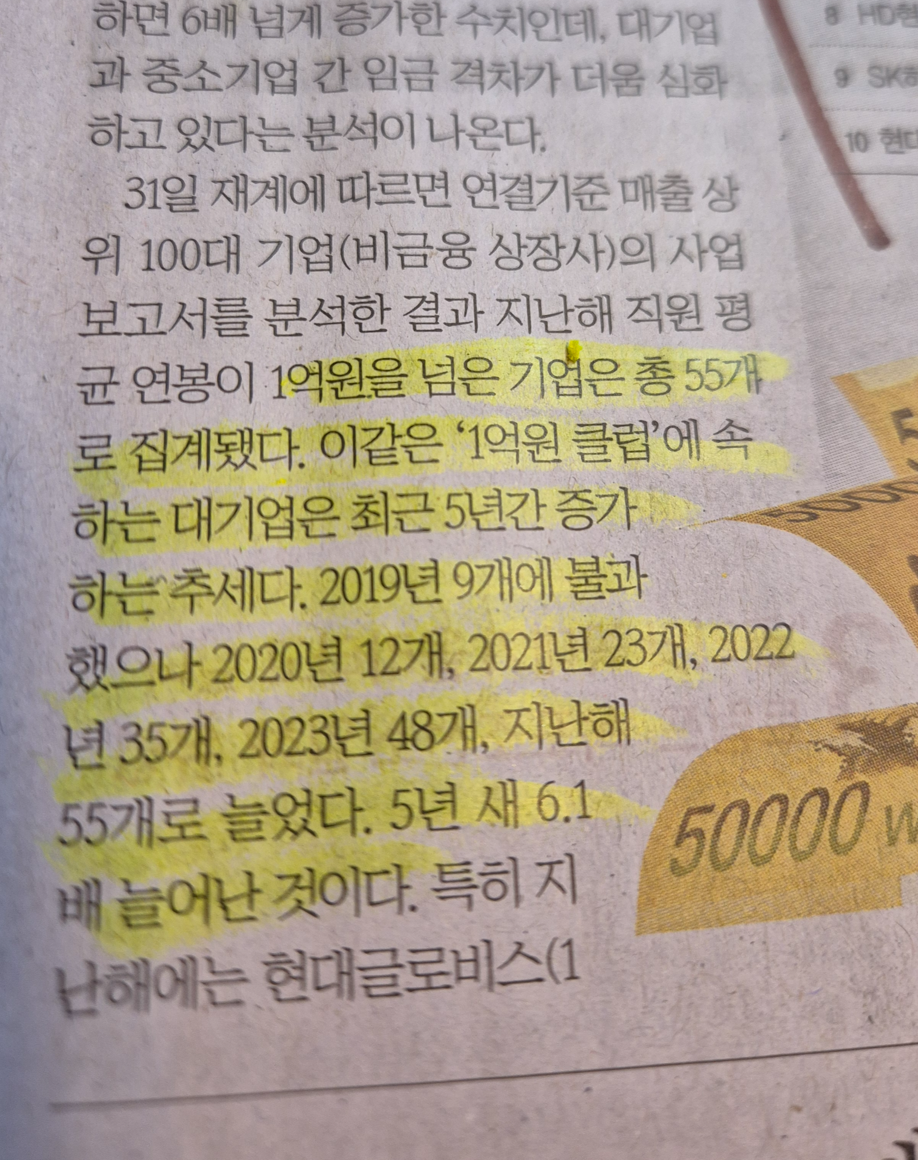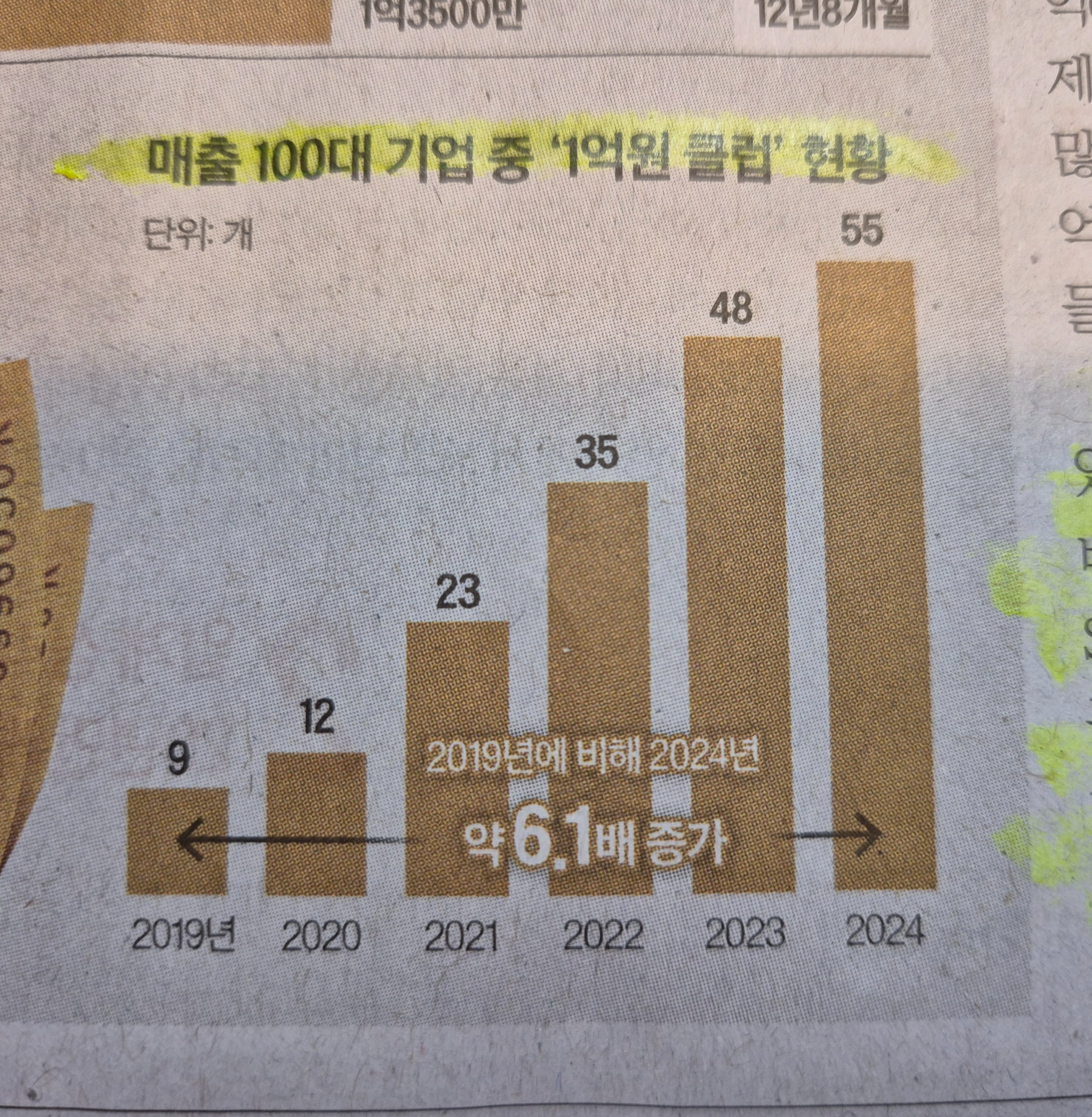 -평균연봉 1억 클럽은 2019년 9곳이였지만 5년 만인 2024년 55곳으로 5년 만에 6배가 넘는 임금 상승을 보여주고 있다.