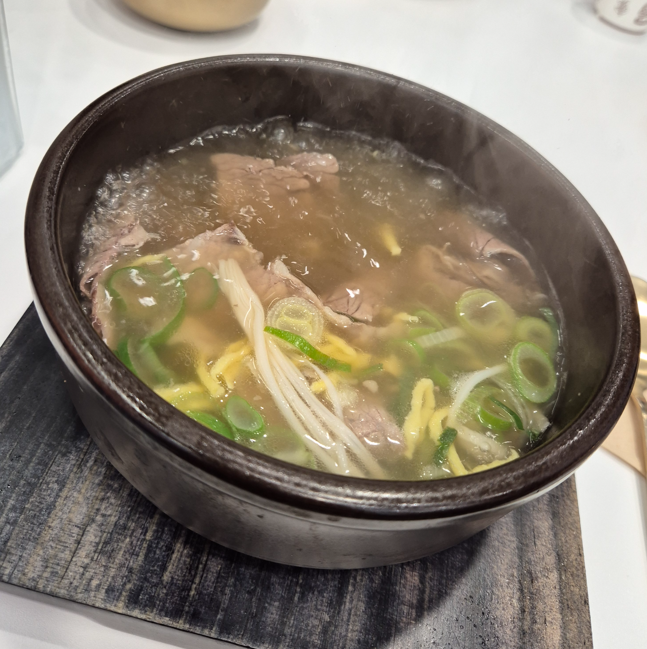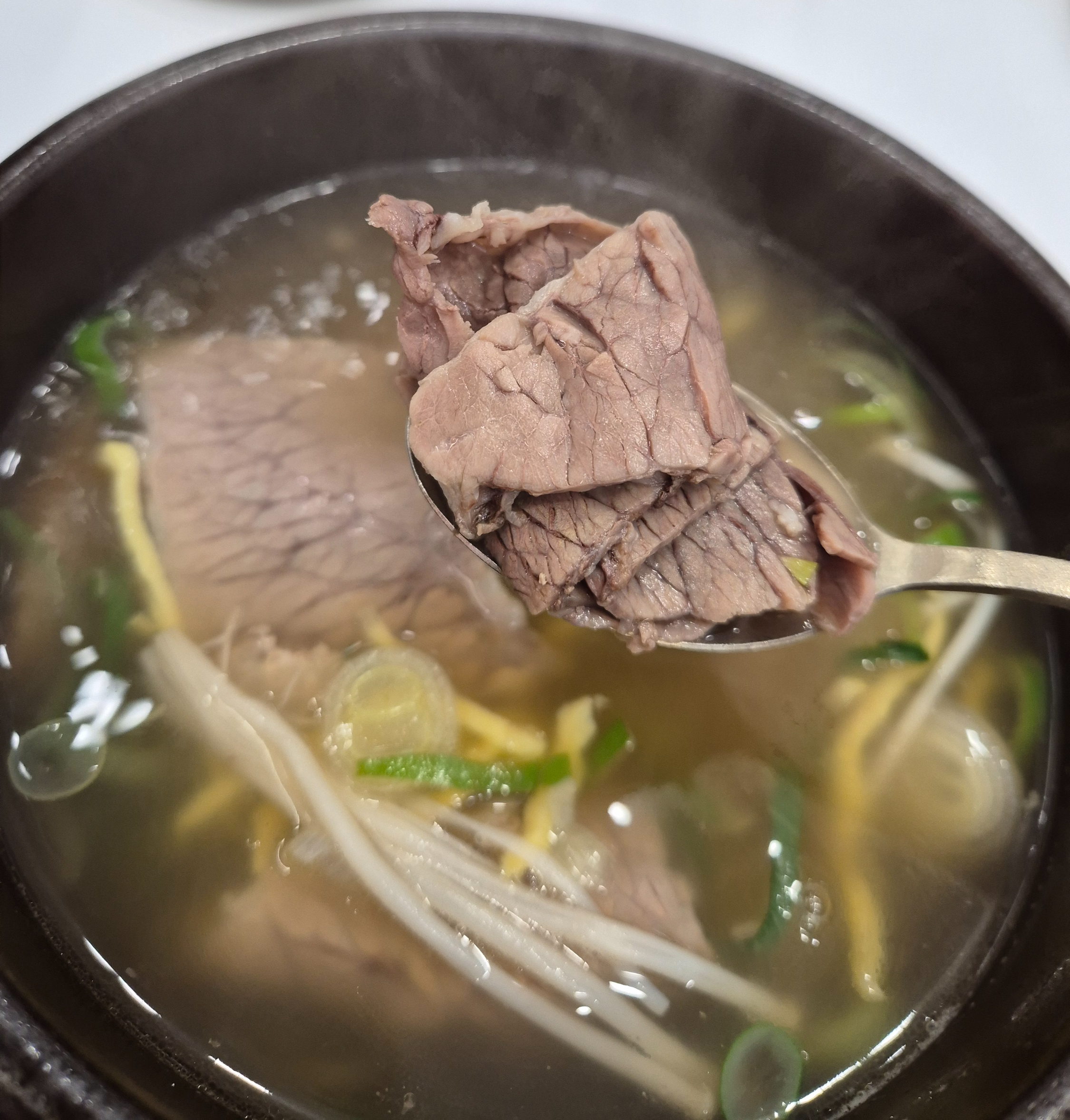 곰탕 특유의 담백하고 맑은 국물과함께 절편 스타일의 고기와 팽이버섯 계란지단까지