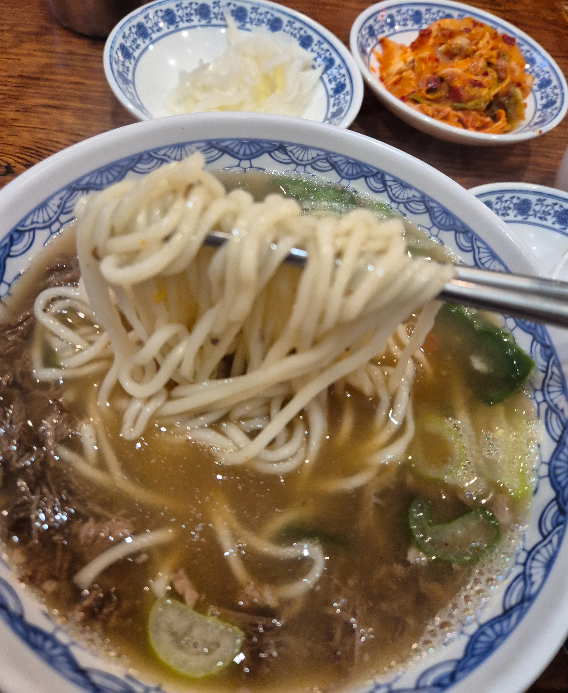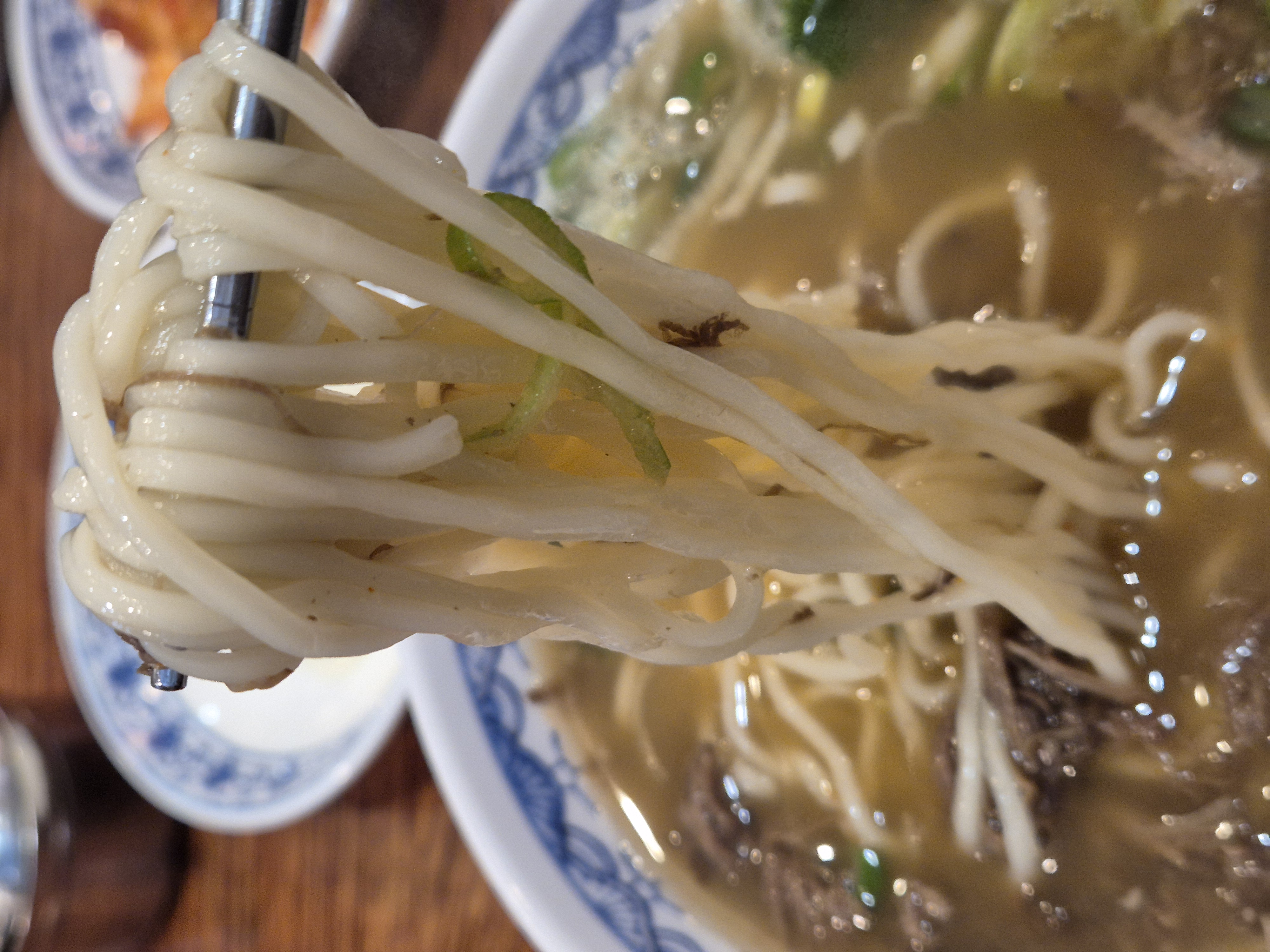 국물은 대체로 간장과 향신료(팔각, 정향, 진피 등)로 맛을 내며, 맑은 편이지만 깊은 맛이 납니다. 중화 향신료의 풍미가 특징적이죠. - 면 – 알단테 스타일의 알카리성 계란면: