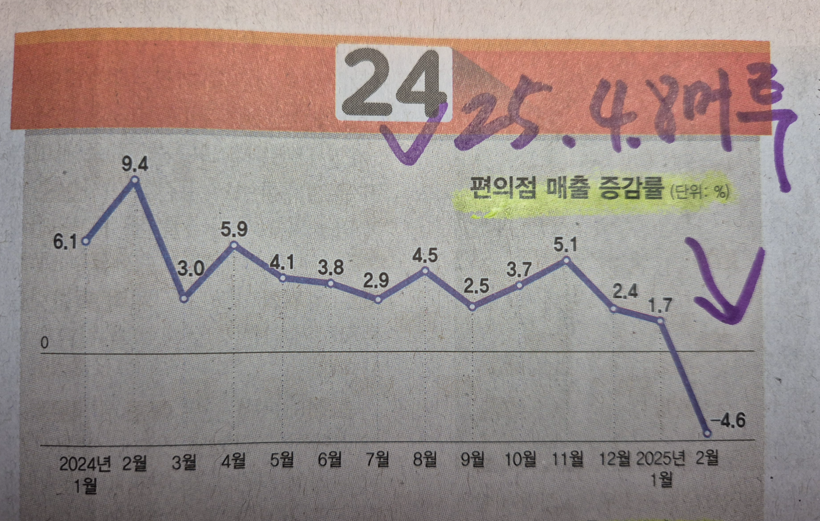 2025년 2월 기점으로 크게 편의점 매출 증감률이 하락하여 -4.6%라는 수치를 보여준 것이다.