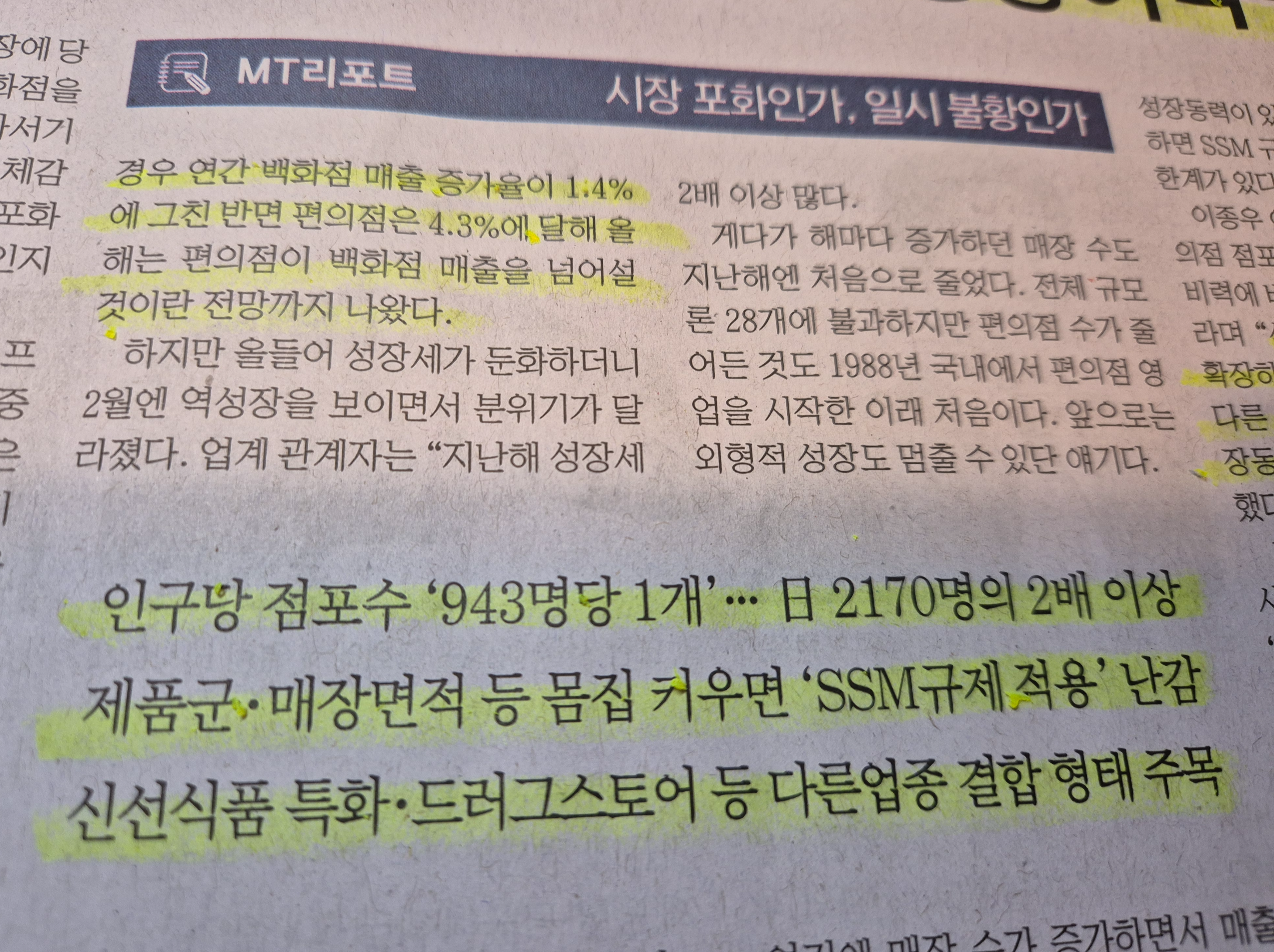 제품과 매장 확장성을 통해 다양한 서비스와 상품을 제공하고 싶지만 가게가 커지는 경우 SSM 규제가 적용되어 제재를 받게 된다고 한다.
