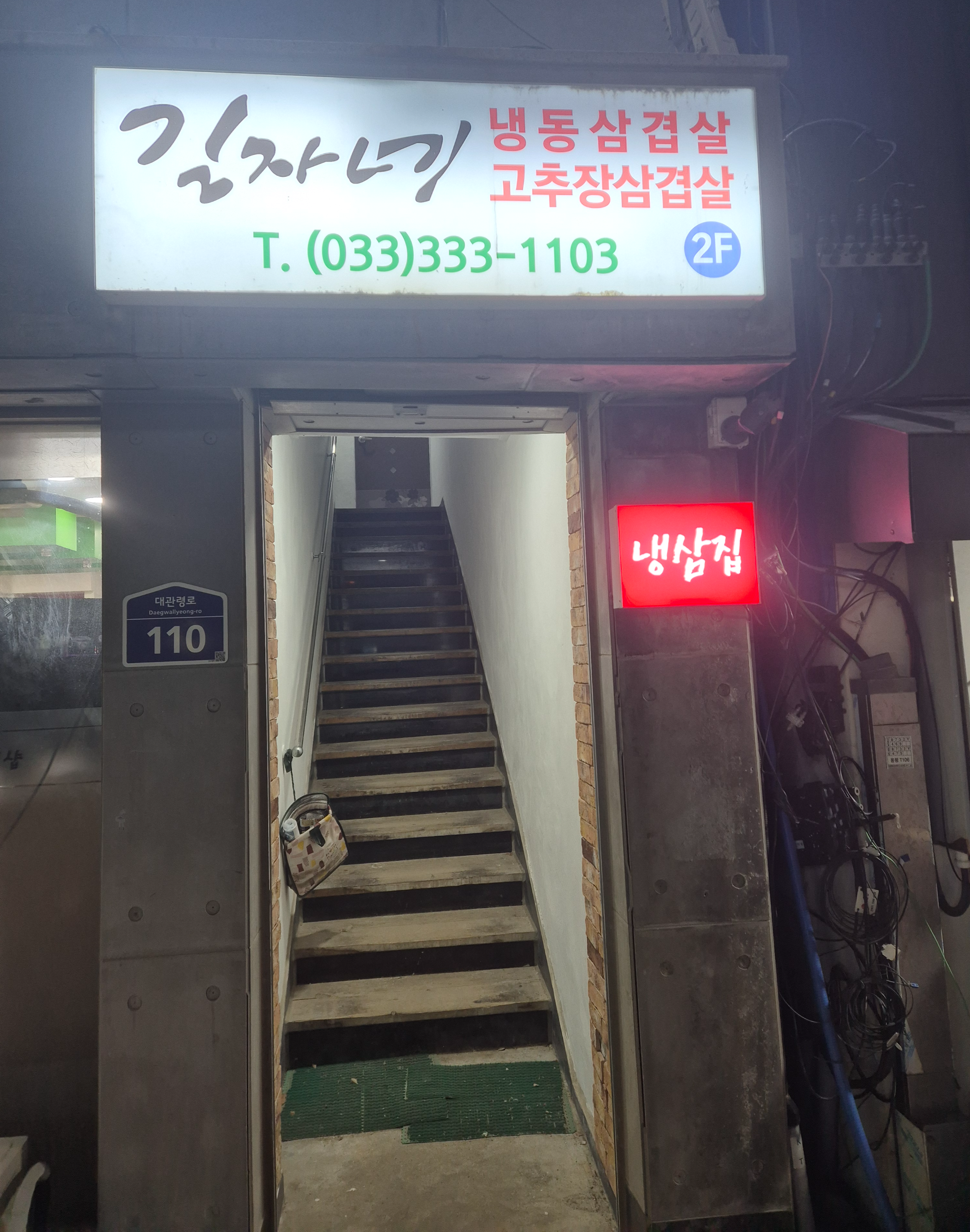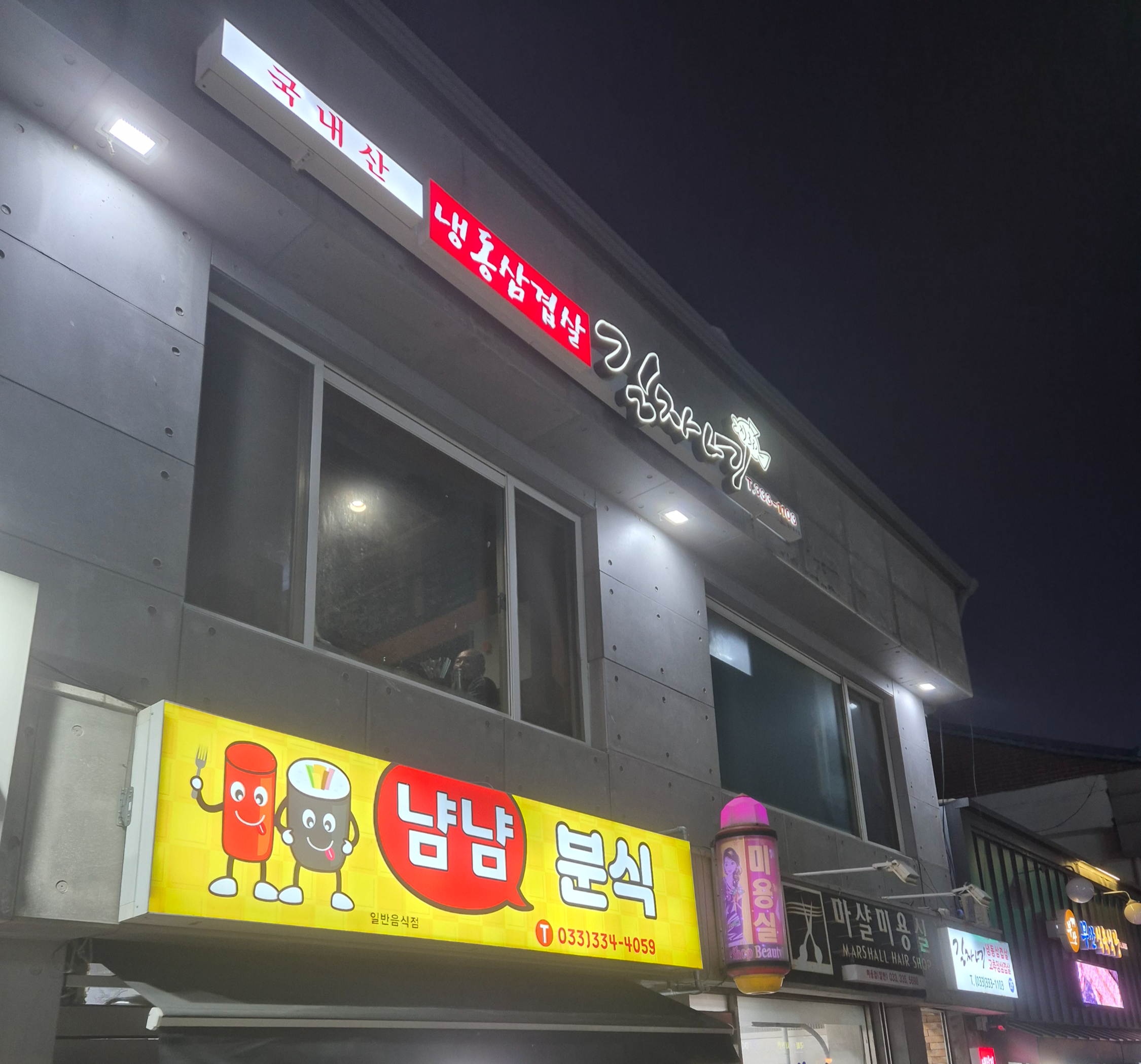 구수한 가게 이름과 더불어 간판에 국내산 냉동삼겹살 전문점이라는 적혀 있는 것이 눈에 뜨인다.