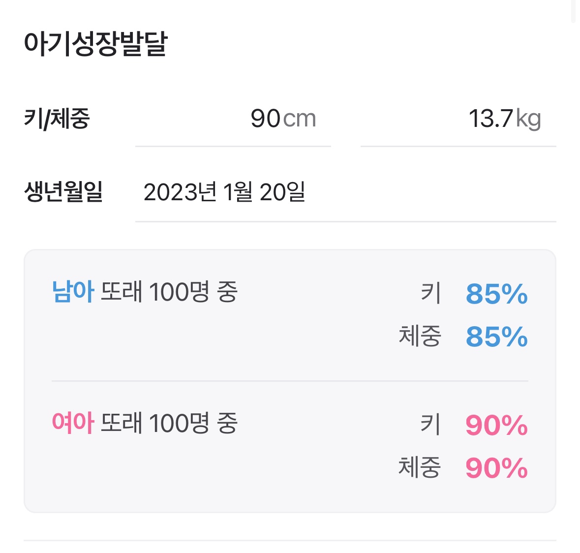 2녀 만에 체크하는 우리 딸은 90cm 13.7kg, 2세 아이 기준 85.7cm 11.5kg에 비교하면