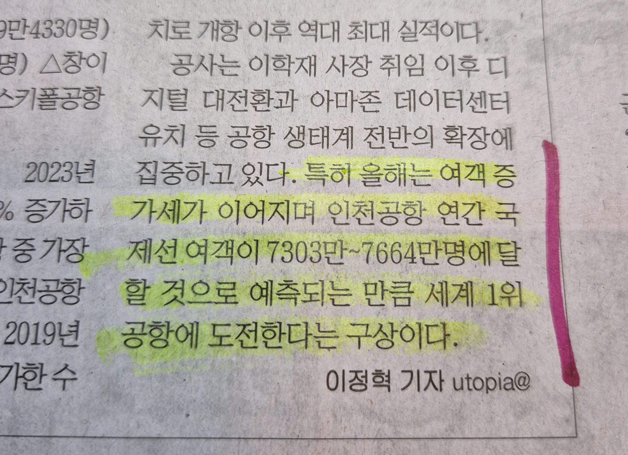- 기사에서는 이학재 사장의 경영 결실이라는 포장이지만 우리는 알고 있다. 최근 공항의 인력 부족과 보안직원의 잦은 교체로 인하여 출국 준비가 힘든 부분을 2시간 전에 도착해서는 출발하기 힘들기도 한 연휴 시즌의 모습을 보면 외부에서 보이는 모습만을 중시하는 듯하다.