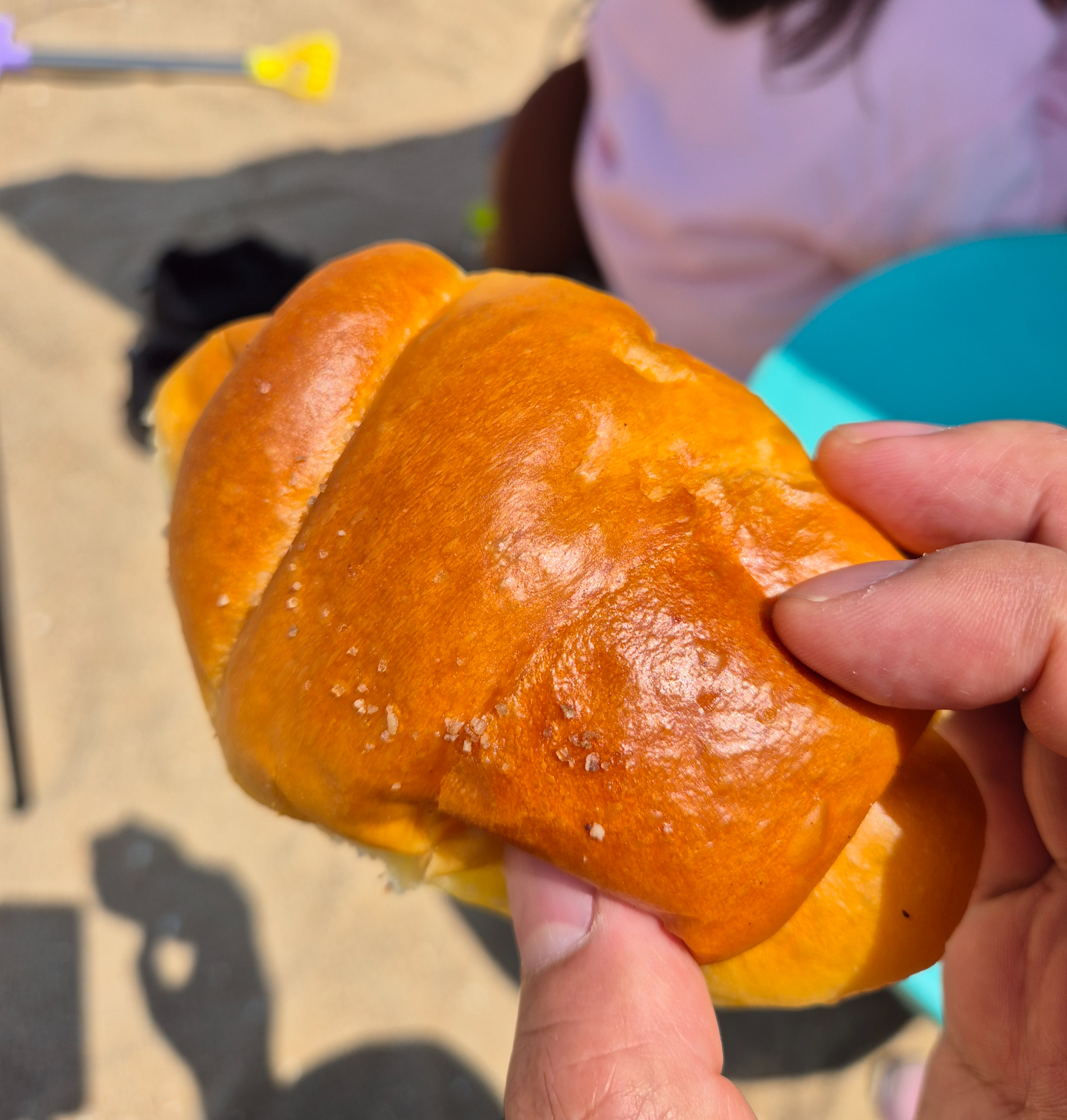 - 빵을 처음 꺼내보면 별 다를 것 없이 프랜차이즈 베이커리에서 판매하는 소금빵과 비슷해 보인다.