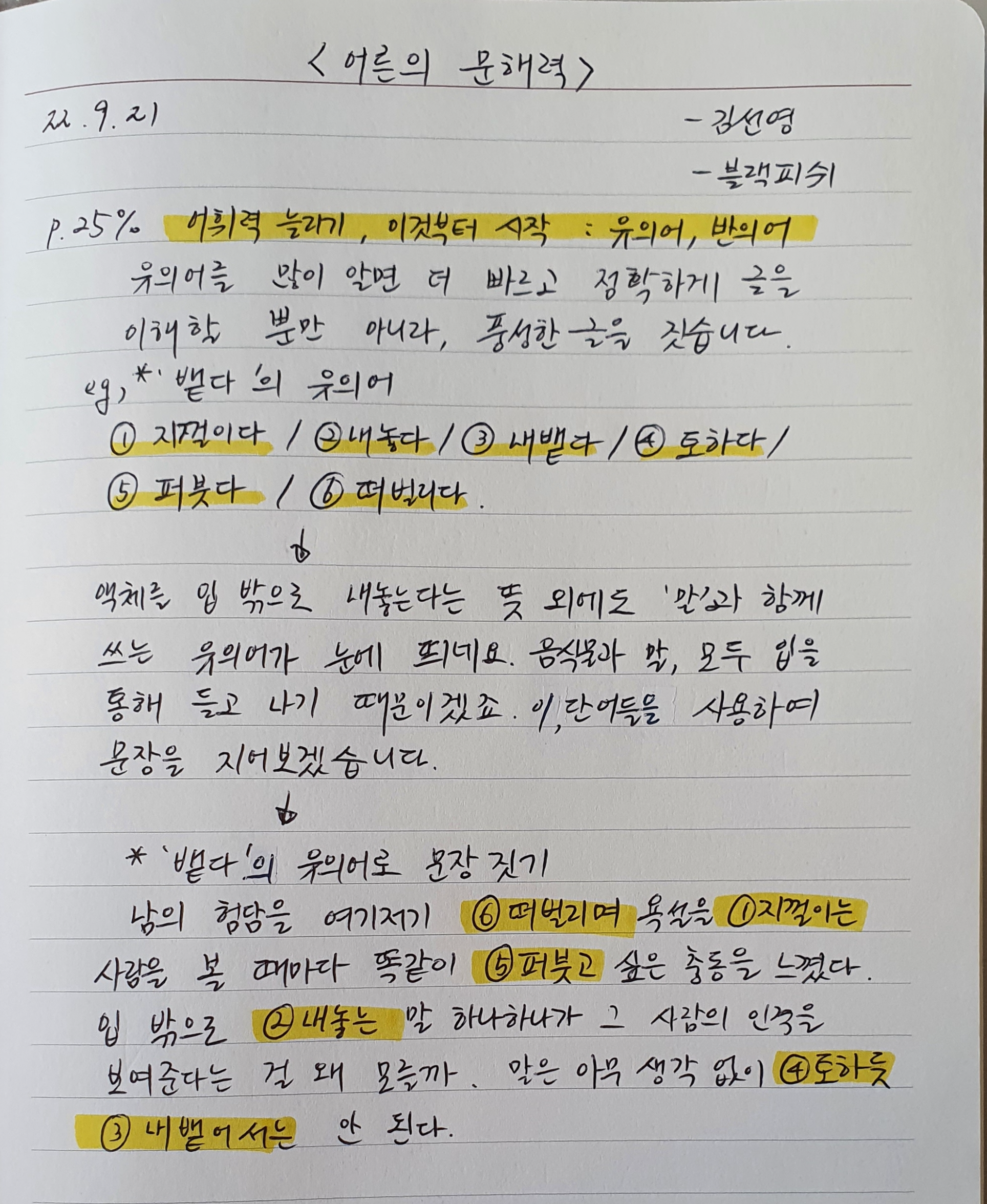 어른의 문해력 책을 읽다가 같은 의미의 유의어를 사용하며 문장을 만들고 실력을 기르는 법을 찾아 노트에 기록해두었다. 목차와 같이 책의 가이드라인을 따라가면 자신의 글쓰기 능력과 독해력을 기르는데 큰 도움이 될 것으로 생각되었다.