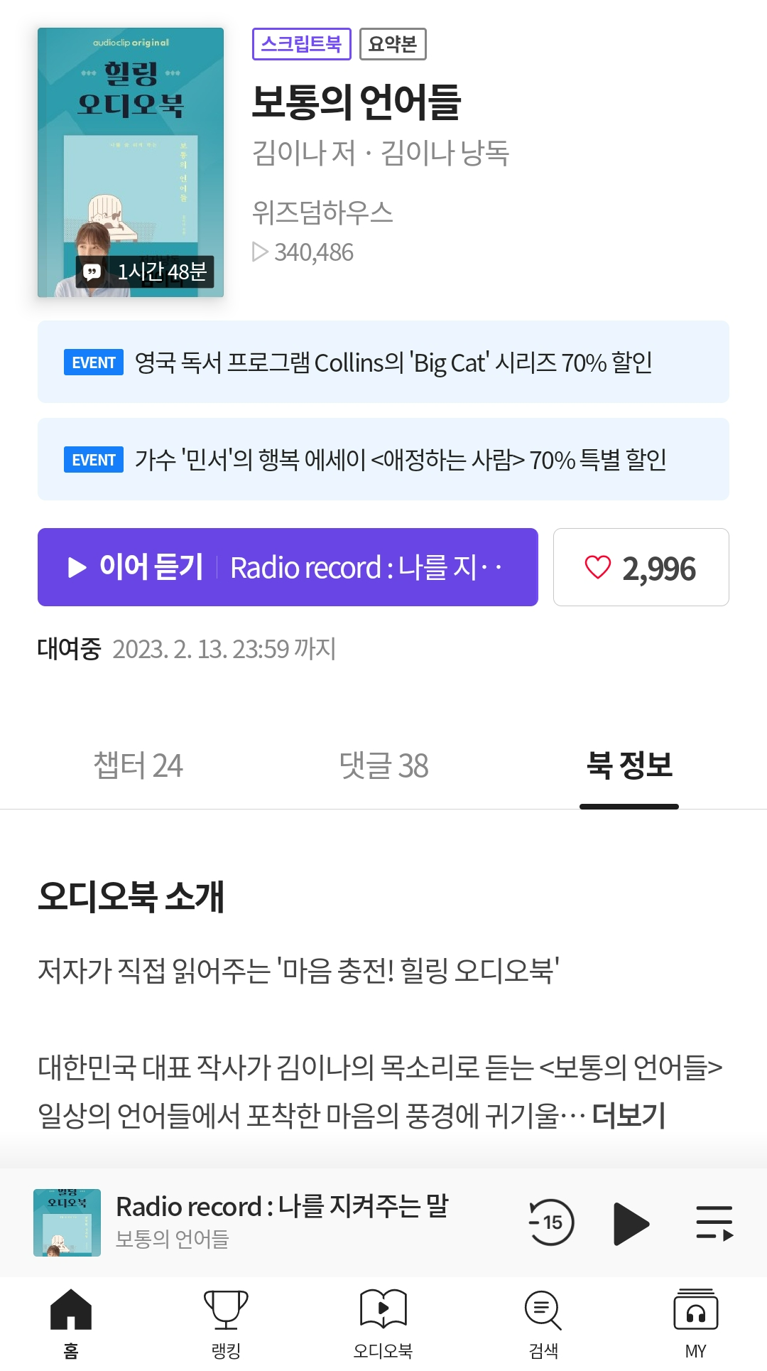 오디오북 요약본 1시간 30분정도의 시간으로 함축된 책 한권을 읽을 수 있다는 장점이 크다. 종이 책으로서 읽었지만 역시나 이 책 역시 라디오나 티비에서 활약하시는 김이나 작가 님의 목소리를 들으며 오디오북을 즐길 수 있다는 것이 큰 장점이였다. 책을 완독하고 요약본으로 되새김질 하듯 책 읽어보는 걸 추천.