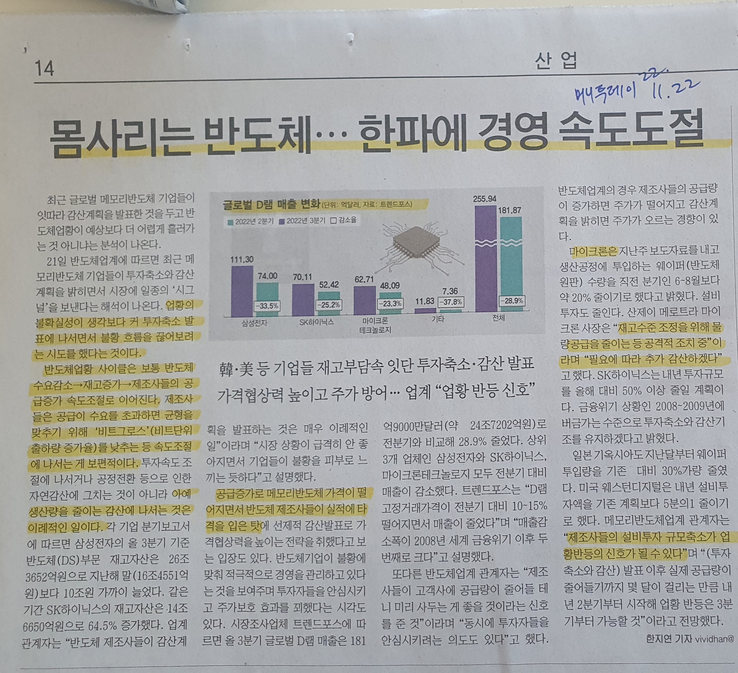 2021년 이 맘때 유튜브에서 반도체 사업의 2022년 예측 영상이 있었다. 위드코로나의 마무리로 인하여 전세계적으로 반도체에 대한 탄탄한 수요와 파운드리 사업까지 공격적으로 투자하여 삼성전자와 SK 하이닉스 양사 모두 큰 성장을 2022년에도 이룰 것이라는 내용이였다. 영상의 내용을 보면서도 전문가 답게 옳은 말이라 생각하였지만 알다시피 올해의 방향성은 큰 변수가 많았다.