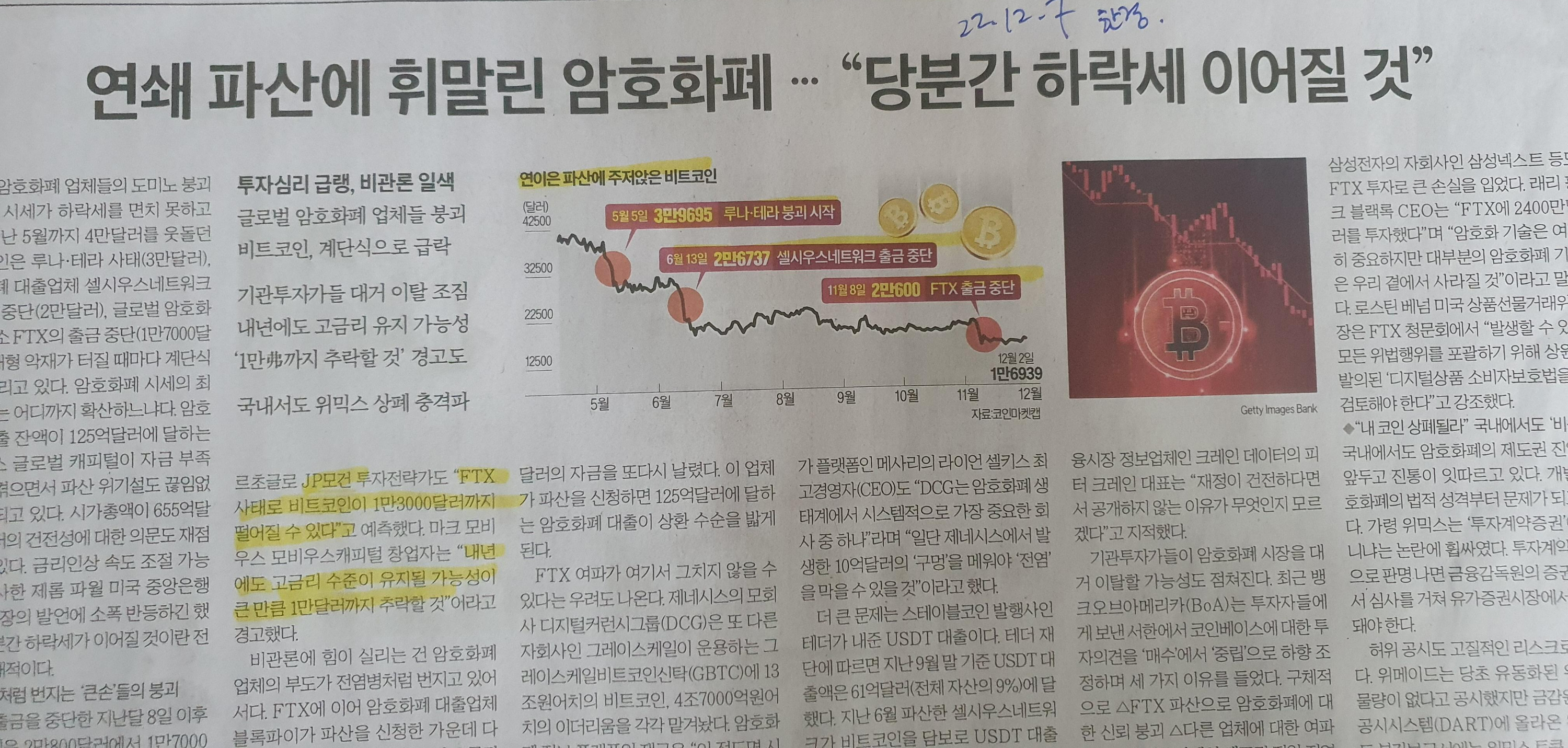 연쇄 파산에 휘말린 암호화폐 22.12.7 한경
