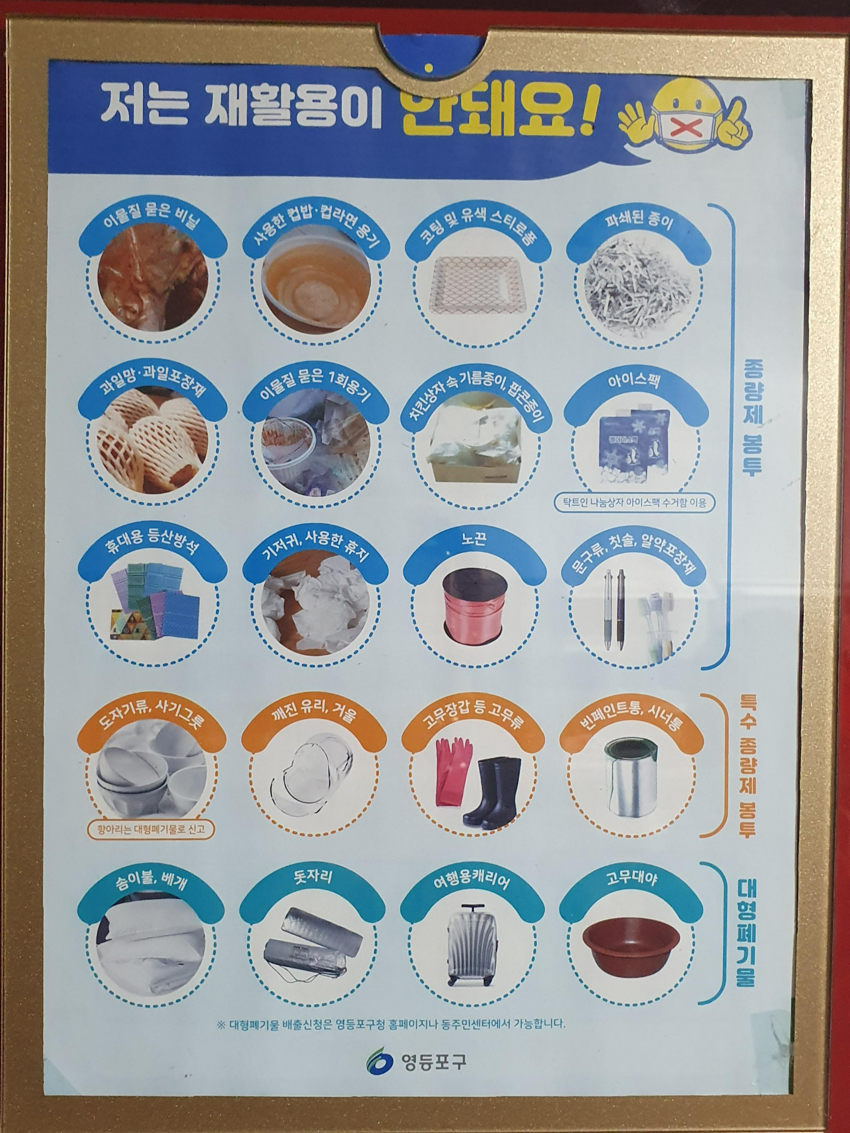 쓰레기가 생기고 재활용 분류를 하려 매번 작업을 할 때마다 인간 한명이 이렇게 많은 오염 물질이 나오는데 영등포에서만 나오는 이렇게 많은 쓰레기를 처리하는 것도 큰일이라는 생각이 든다. 그리고... 무엇보다 어려운 건 알듯 말듯한 재활용 용품이 안되는 용품들을 구분하는 것이다.