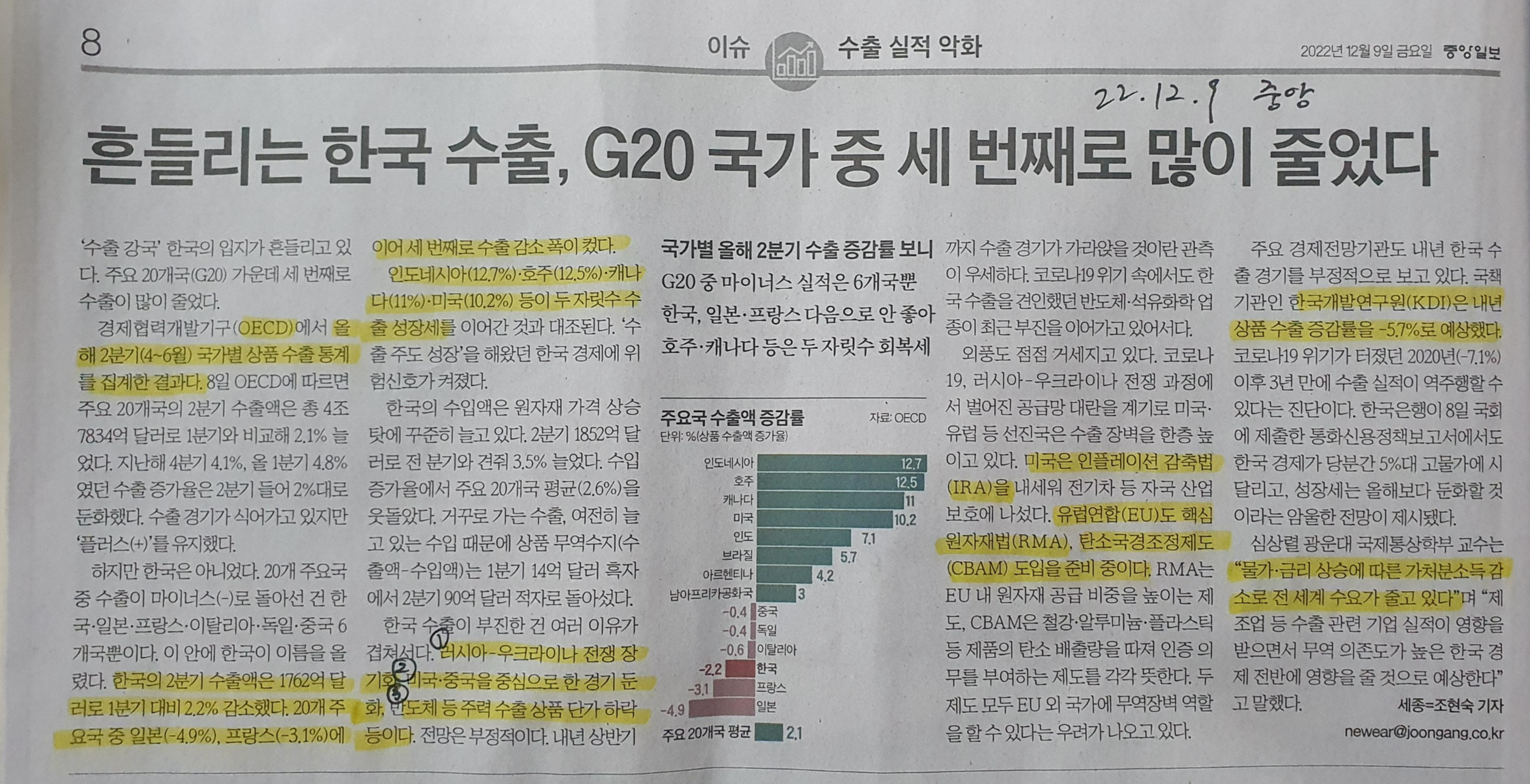-OECD 올해 2분기(4-6월) 국가별 상품 수출 통계 , 한국의 2분기 수출액은 1762억 달러로 2.2% 감소