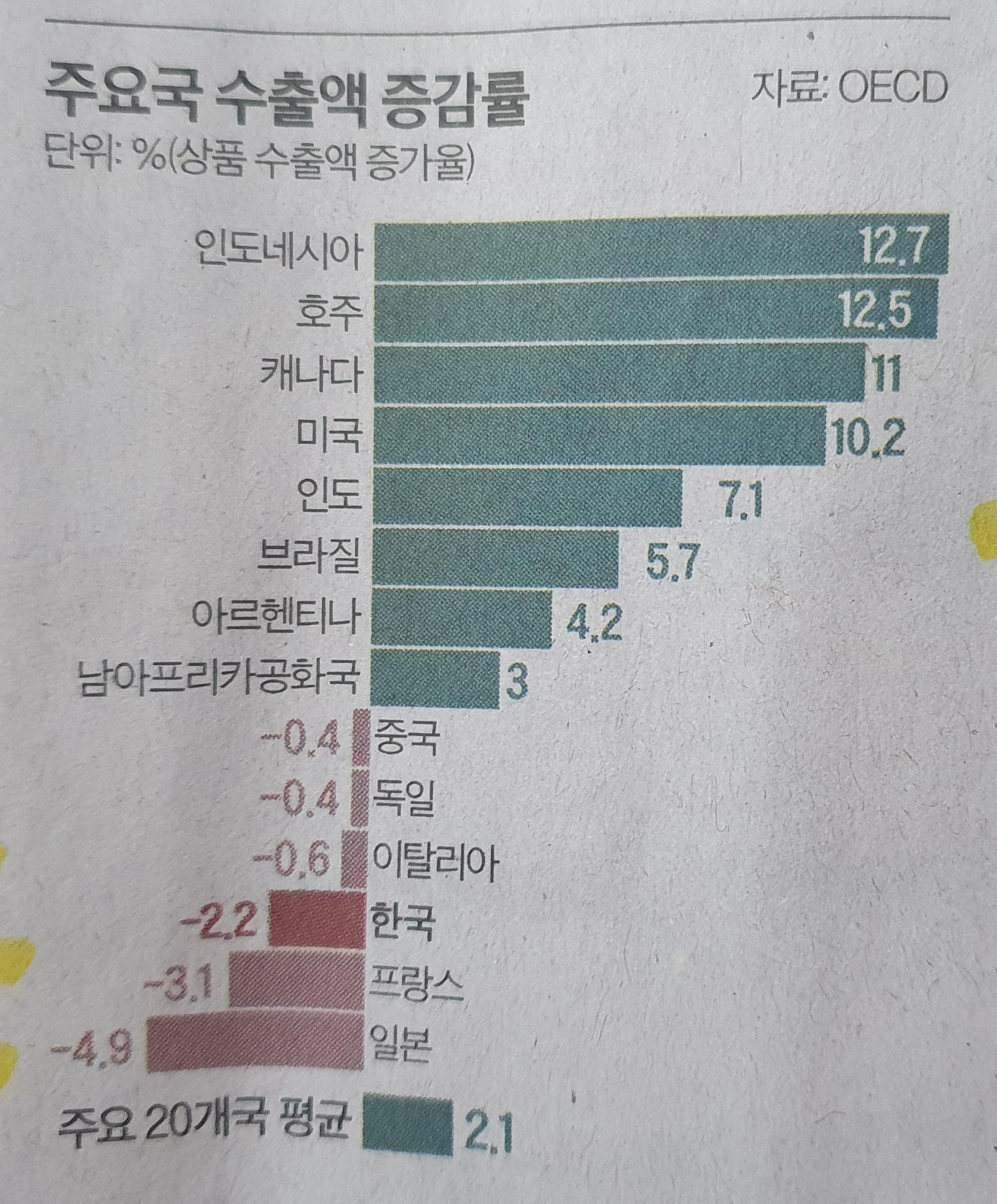 #한국 수출 감소, G20 국가 중 세번째 / 주요국 수출액 증감률 차트