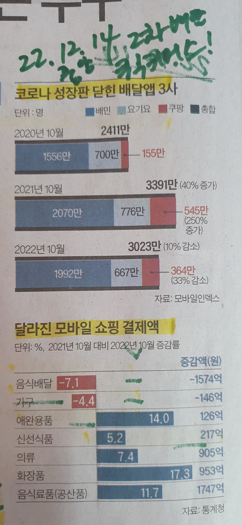 배달앱 3사 실적 감소세 / 모바일쇼핑 증가 품목 22.12.14 중앙