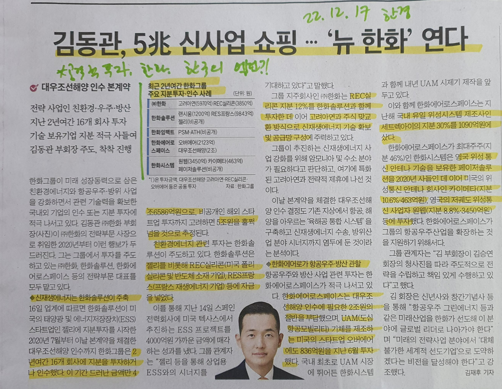 추가, 한화의 큰 그림이나 뉴스가 체크되면 정리해야 겠다.