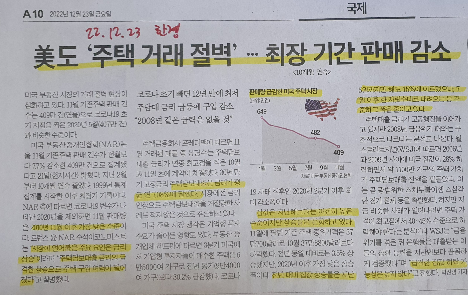 주택거래 급감한 미국 주택 시장 / 22.12.23 한경