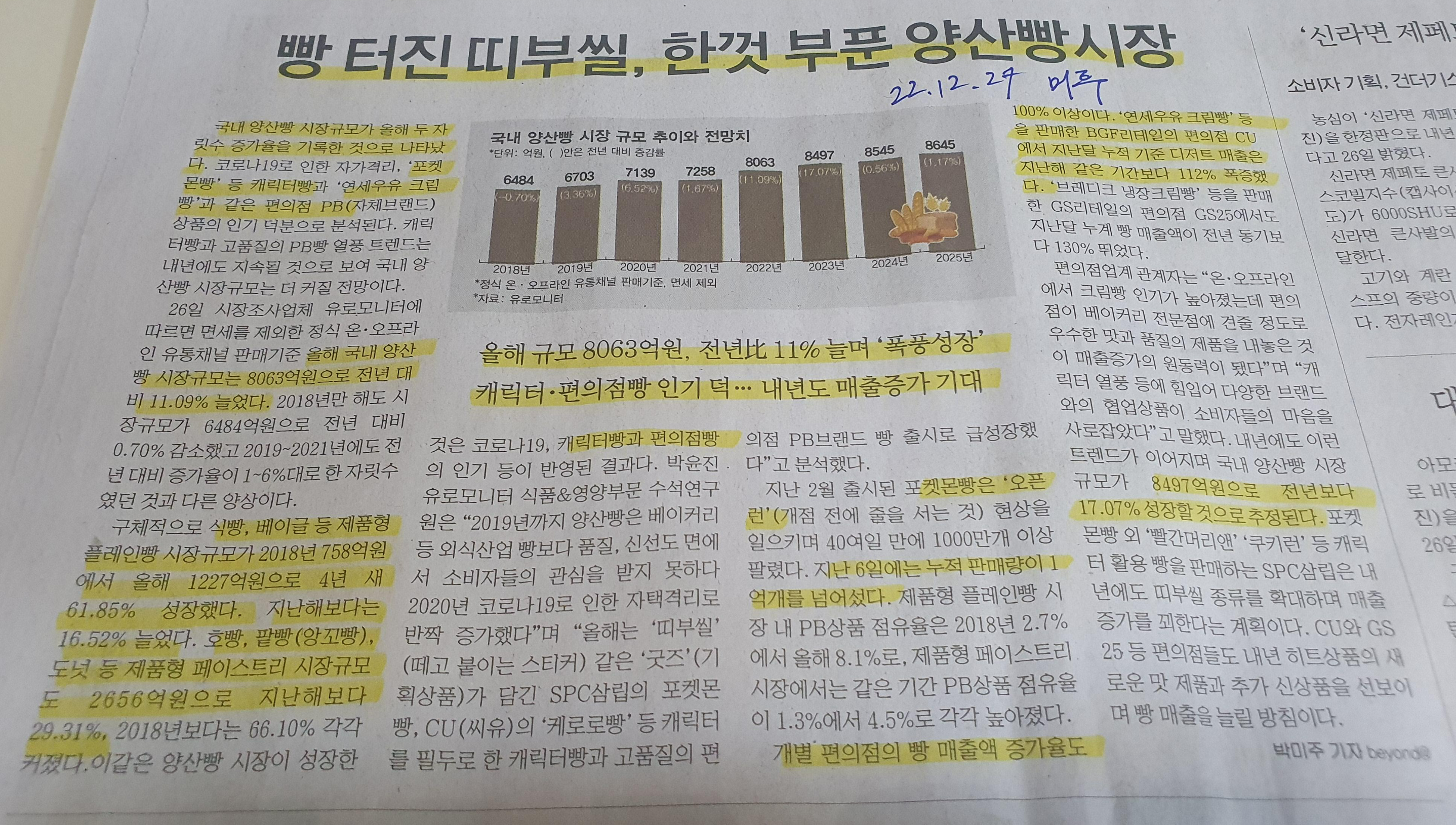 Comment) 2022년 큰 성공을 거둔 양산빵 시장. 시장 규모는 올해 8천억원이 넘어섰으며 작년대비 11프로 이상 성장하였다. 큰 성장의 가장 큰 이유는 캐릭터빵 포켓몬, 디지몬 빵으로 대표되는 띠부씰이 폭팔적인 인기를 얻으며 큰 판매량을 가지게 되었다. 또한 편의점에서 판매하는 빵도 일반빵에서 벗어나 신선함을 필요로 하는 냉장빵과 연세빵처럼 특색있는 제품 라인업으로 다양화 된 부분도 큰 차지한다. 2023년 예상은 올해보다 더 성장하여 8400억원대 17프로 성장이 예상된다 하는데 이미 캐릭터 빵의 열풍이 어느정도 가라앉은 상태라 올해와 같은 성장을 이끌수 있을까 지켜보게된다.