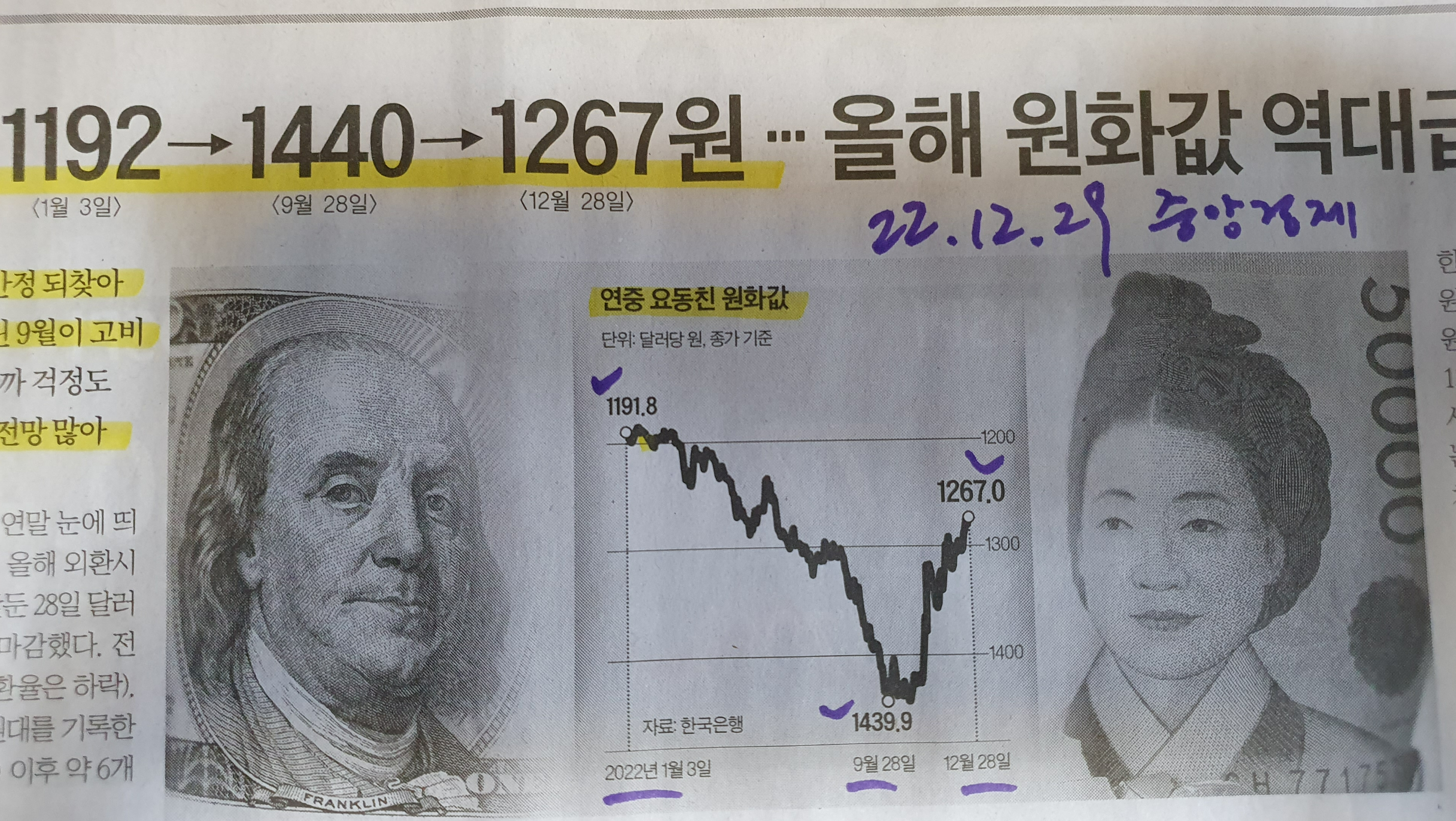Comment)) 2022년 상반기 까지만해도 1100원대 몇 년간 유지하던 원화값이 1200원, 1300원을 넘어가더니 1400원 대라는 역대급 강달러 상황으로 변화하였다. 수출업을 하는 입장에서 이렇게 연초에 비하여 300원 가깝게 차이는 영향성이 크게 다가왔다. 10월달 이후 원화 가격은 다시 안정화되어 1200원대 중반에서 정체중이다. 2023년은 환율 안정화가 예상 된다고 하지만 상황은 어떻게 바뀔지 아마도 모르는 상황.