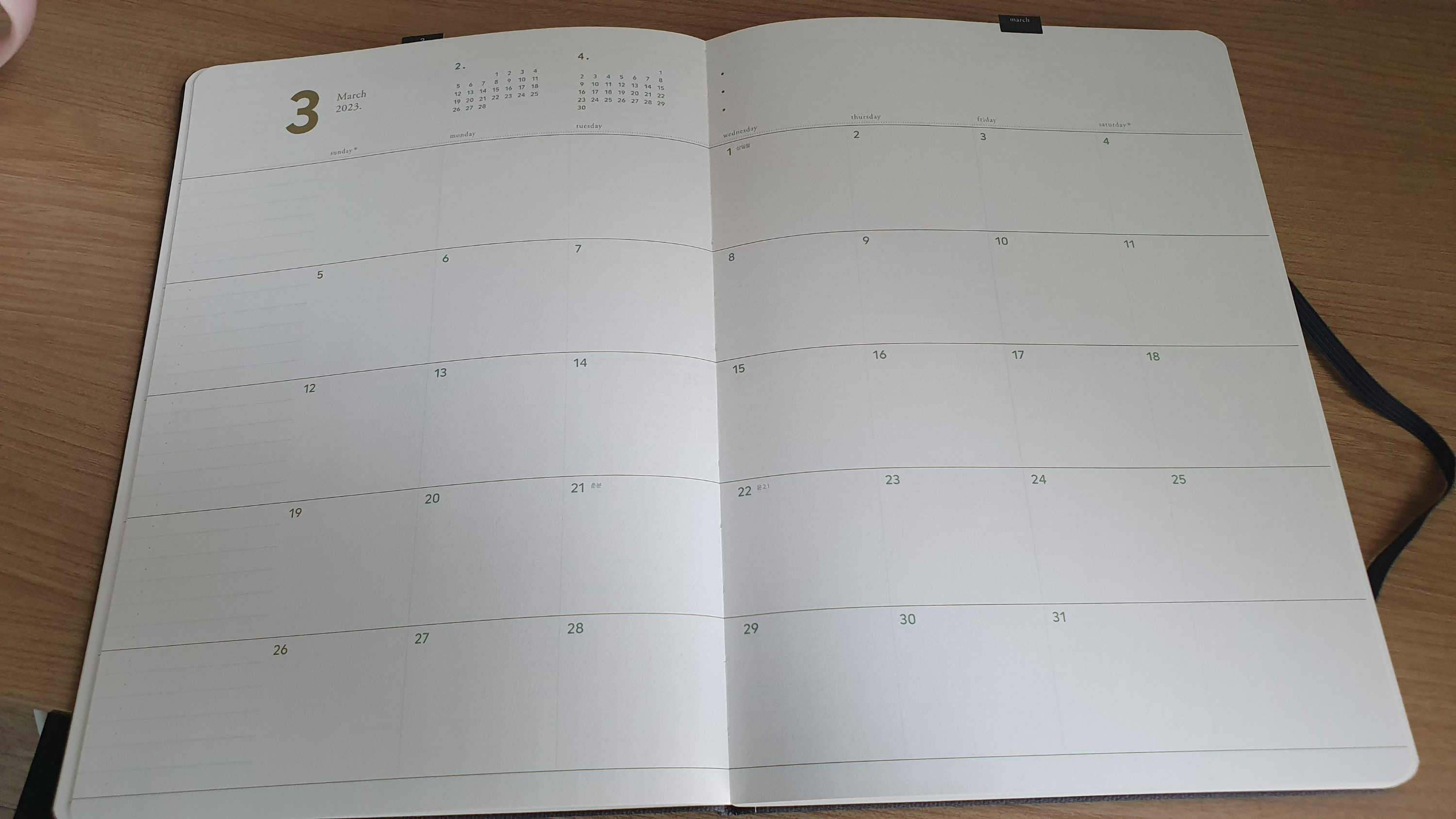 종이의 질이 얇지 않고 적당히 두꺼우며 매일 기록하며 적기에는 충분한 사이즈와 섹션별 구분이 잘되어 있다는 점이 만족스러웠다. 1년 동안 알차게 써보고 아마도 몇 년간은 같은 브랜드와 사이즈 제품으로 사용할 것 같은 예감이 든다.