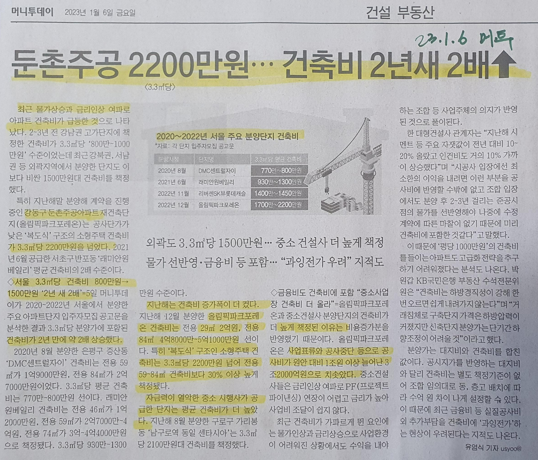 -최근 물가상승과 금리인상 여파로 아파트 건축비가 급등, 2년새 2배 상승세