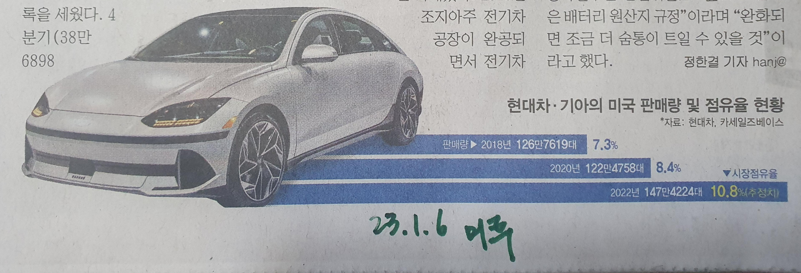 Comment)) 정리한다면 일본차 강세인 미국 시장에서 1위는 GM이 차지하여 미국 국적의 자동차 회사 선전과 한국 자동차 회사인 현대,기아 판매량이 전년대비 괄목한 성과를 이루었다. 특히 기존의 자동차가 아닌 전기차 시장에서 공격적인 마케팅과 판매전략으로 성과를 만들어내고 있다. 미국 IRA 에서 한국 자동차에 대한 전기차 혜택을 줄이려 했던 것은 눈에 띄는 성장이 큰 영향이 주었을 것이라 생각된다. 한국 기업들은 미국내 전기차 시장 선도를 위해 배터리 및 자동차 공장 건설로 미국내 기업의 가치를 보여주고 있는 상태이다.
