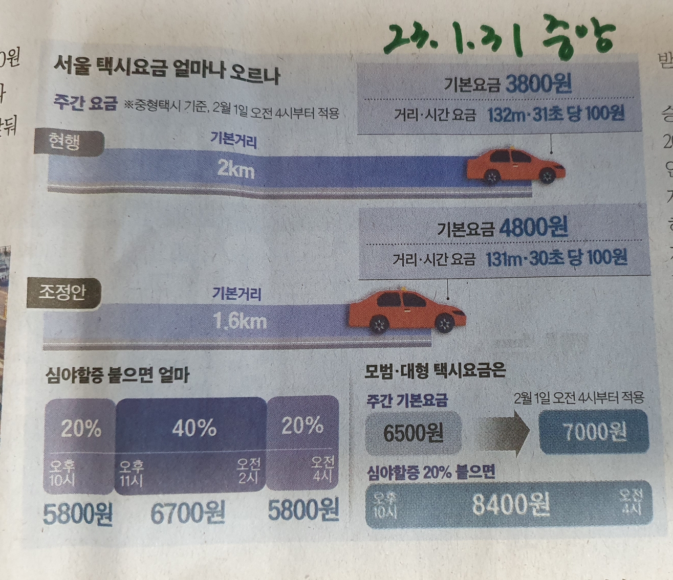 Comment)) 2월1일 가장 큰 생활변화. 코로나 이후 택시타는 일이 1/10로 줄어들었지만 종종타기에 운임뉴스 정리