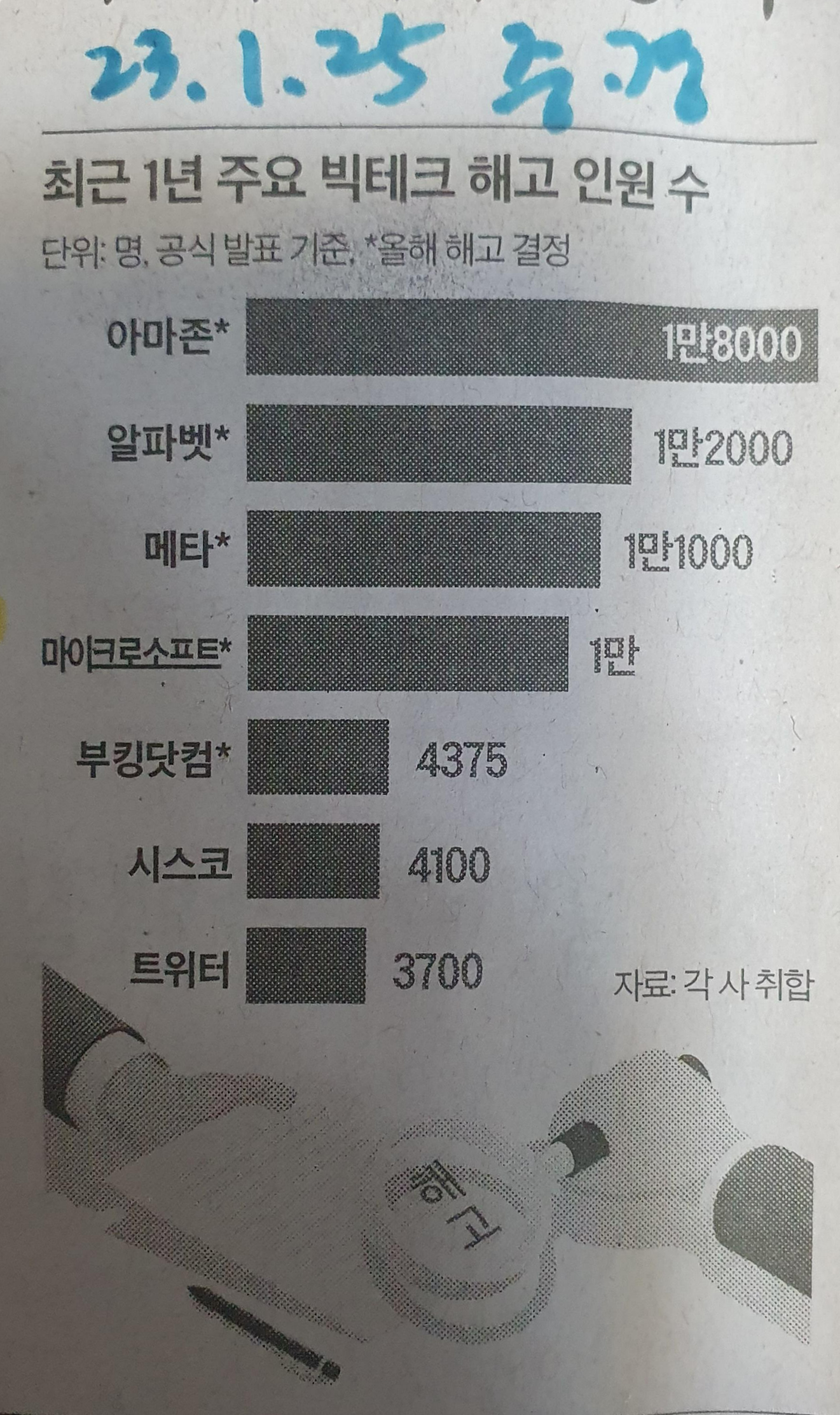Comment)) 미국의 빅테크 회사의 해고 인원 수는 숫자만으로도 엄청나다. 코로나 시즌 고용과 함께 재택을 허가하며 많은 이익을 얻었지만 2023년 다시 겨울이 찾아오게 되었다. 한국에서도 게임사를 중심으로 IT 인력에 대한 구조조정이 조금씩 이루어지고 있기에 눈에 들어와 스크랩해본다.