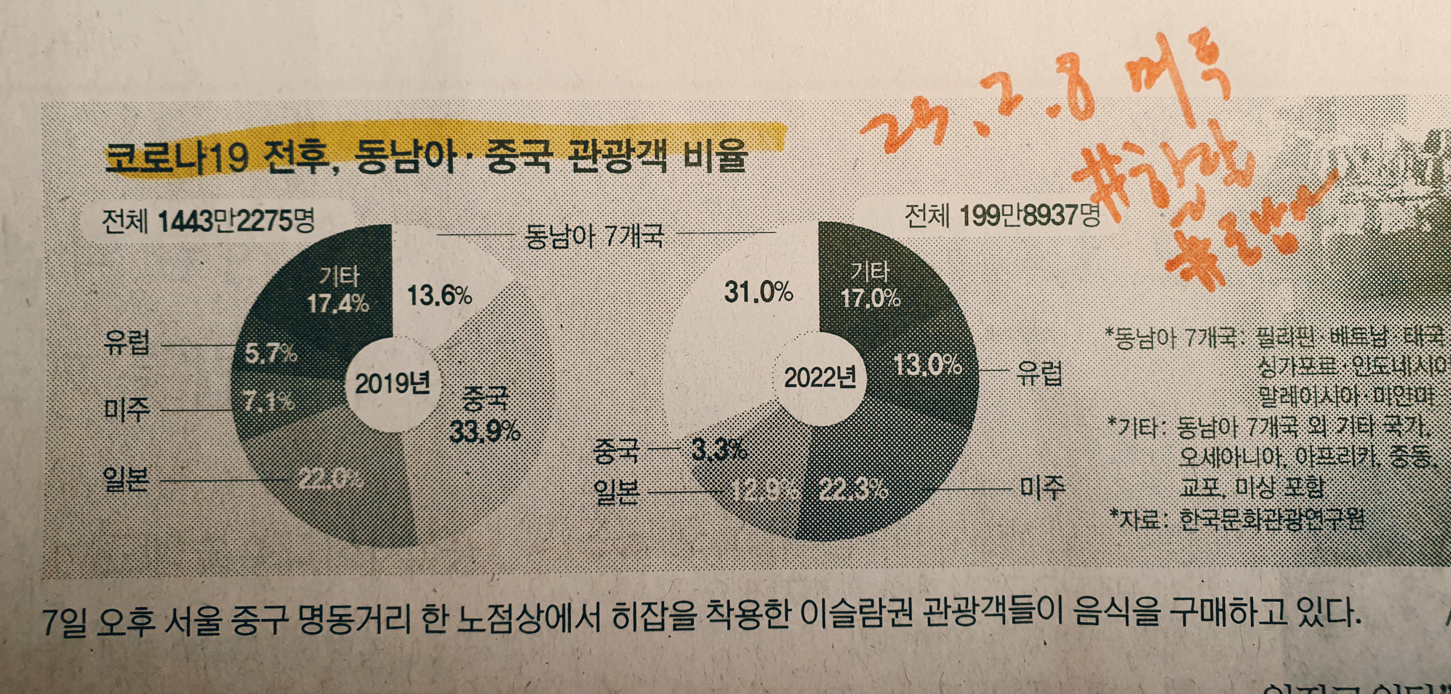 Comment)) 코로나 전 33%를 차지하던 중국 관광객의 비율이 코로나 이후 현재는 3.3%에 머물고 있다. 중국의 관광비자 관련 제약이 현재까지는 크며, 인원을 비교해도 1443만명대 199만의 비교군집에서 발생하는 오차 또한 큰 것이 사실이다. 하지만 코로나 시기의 K팝과 넷플릭스를 필두로하는 한국 컨텐츠 인기로 인하여 동남아에서 한국의 이미지와 방문에 대해 호의적인 부분이 크다고 생각된다. 특히 아랍과 같이 히잡을 쓴 관광객이 시내에서 자주보여 관광객의 방문 포션이 다양화 되고 있는 상황이라 생각된다.