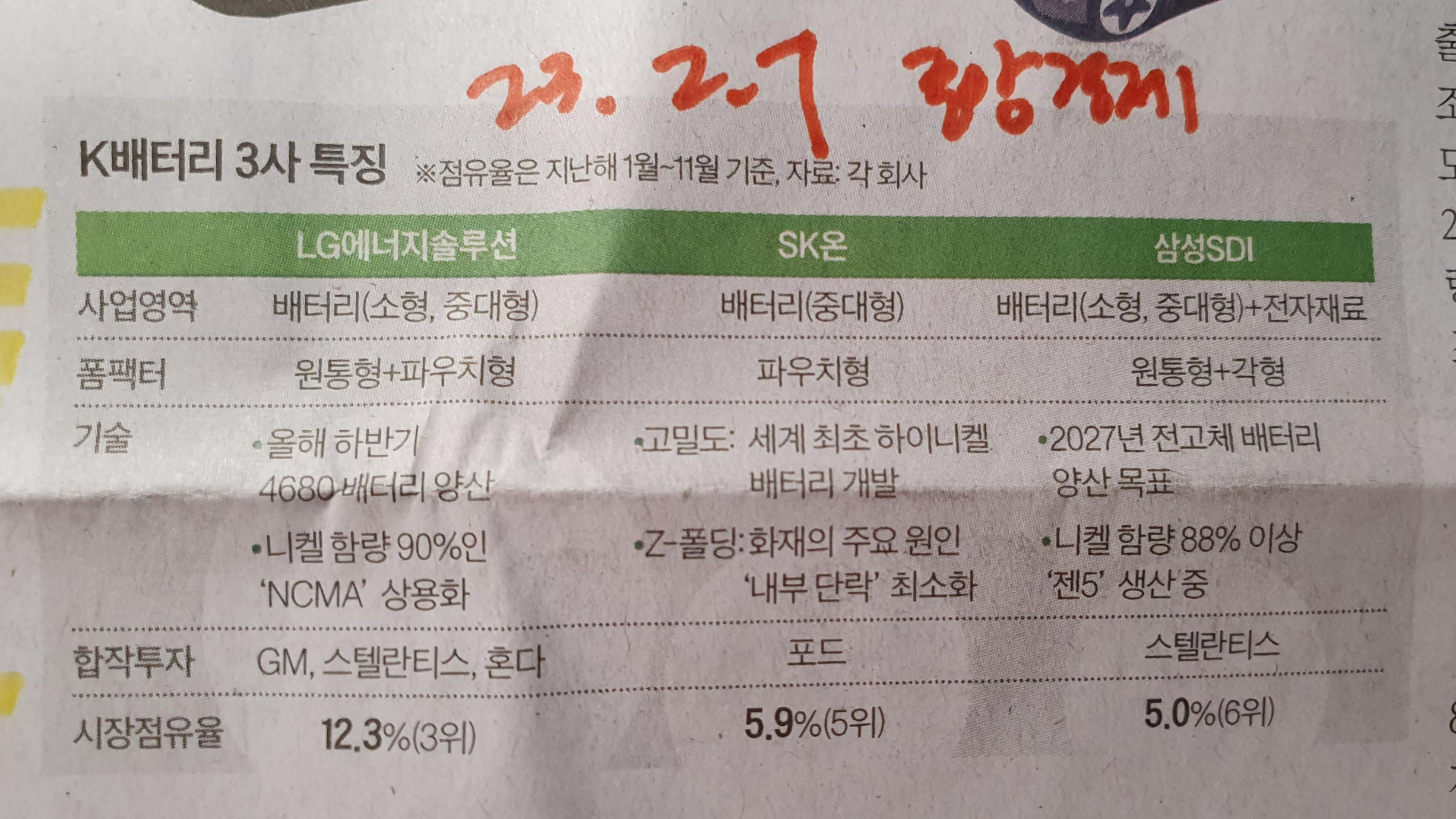 -K배터리 3사 특징, 각 회사마다 기술력과 합장투자의 차이가 있다. 시장 점유율은 LG, SK, 삼성 순으로 중국 배터리 기업과 경쟁하는 중이다.