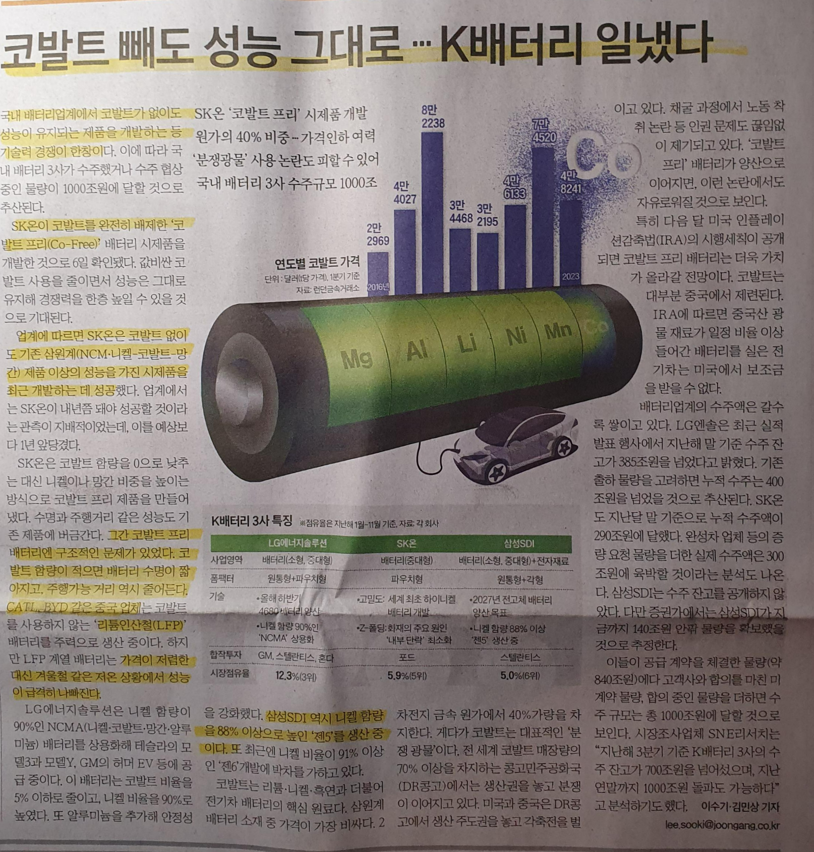 -국내 배터리 생산시 코발트가 배터리 성능의 중요한 부분으로 원가의 많은 부분을 차지하였다. 최근에는 SK온이 코발트를 완전히 배제한 코발트 프리 Co-Fee 배터리는 개발한것으로 확인 된다.