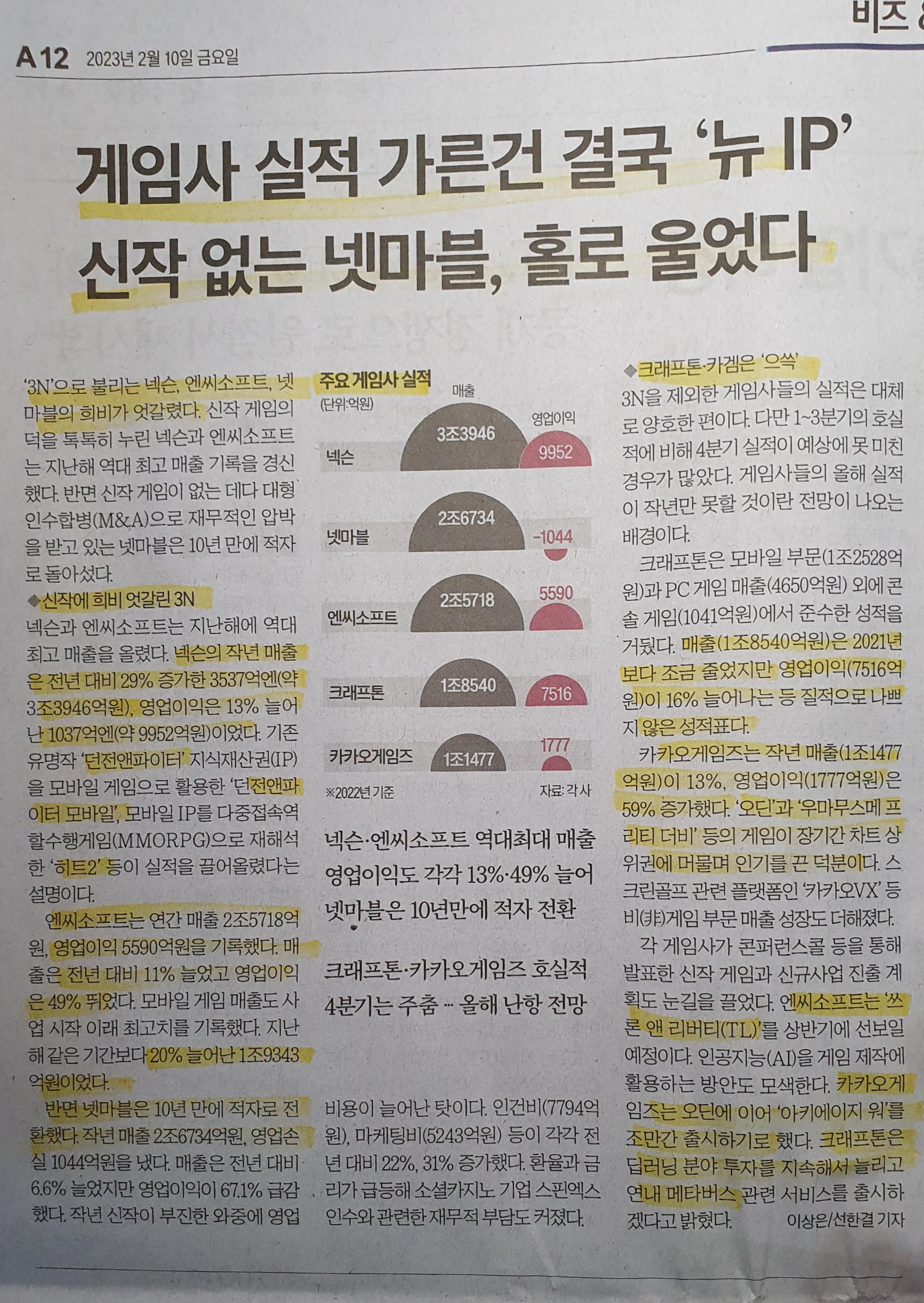 -3N 이라 불리는 게임사의 실적  넥슨 선방, 엔씨 보통, 넷마블 하락, 가장 큰 차이점은 넥슨은 기존의 아이피를 활용하여 모바일 게임화한 던전 앤 파이터즈와 캐시카우 양산형 MMO RPG 지만 꾸준한 히트2가 견인, 엔씨는 기존의 리지니 아이피로 여전히 유지 중이며 유일하게 넷마블의 경우만 신장 게임의 반응이 좋지 않아 10년 만의 적자상태로 영업이익을 마무리하였다.( -1044억원)