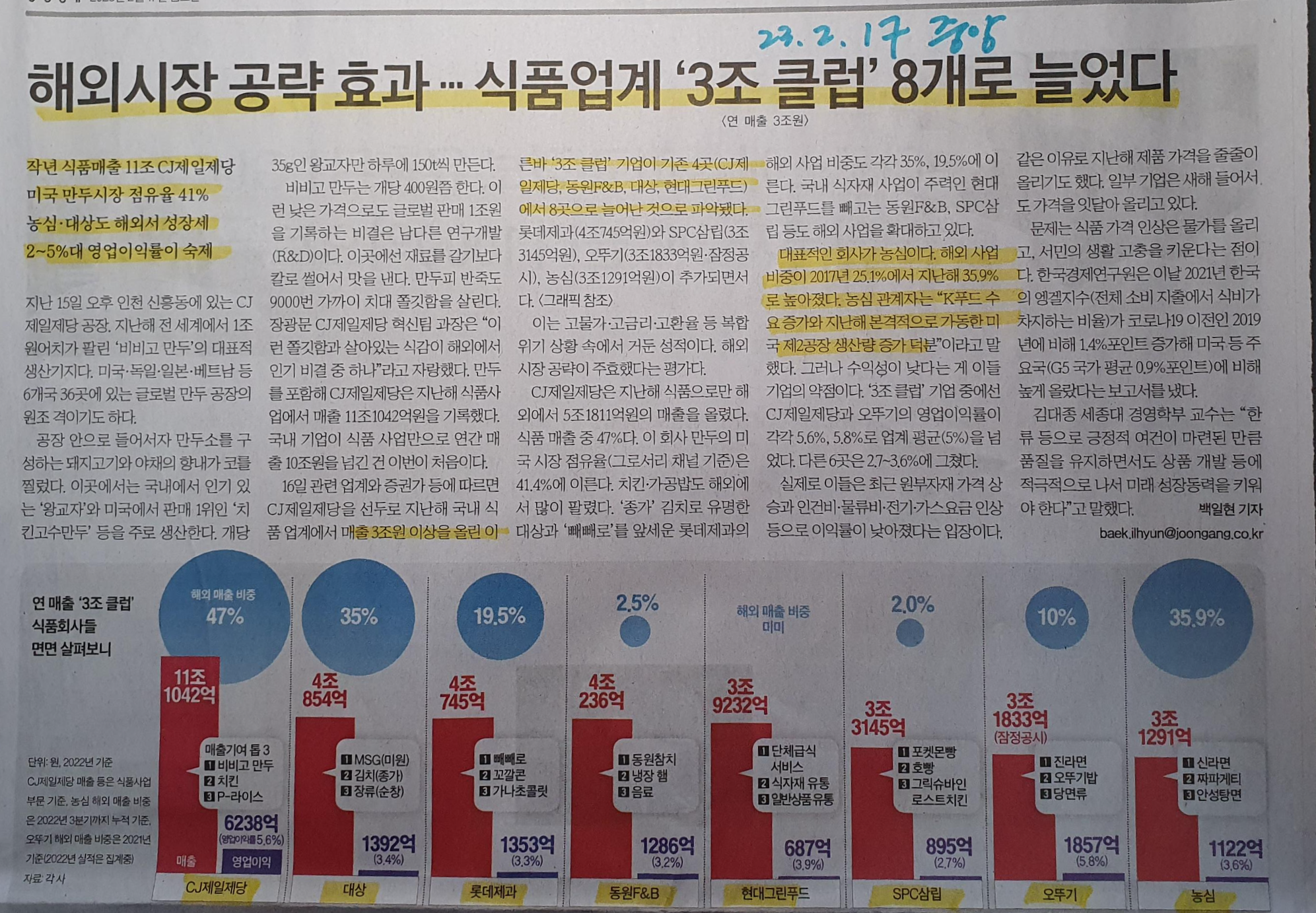 Comment)) CJ 제일제당의 매출액은 다른 식품점에 비하여 넘사 수준. 2-3조를 오가던 기업들도 코로나와 가격 상승 떄문인지 매출액자체는 크게 증가된 상황이다. 기업마다의 특성이 조금씩 다른것을 알수 있다. 특히 식자재나 급식또 b2b 기업인 현대그린푸드가 3조원이라는 규모라는 것이 인상적이다.