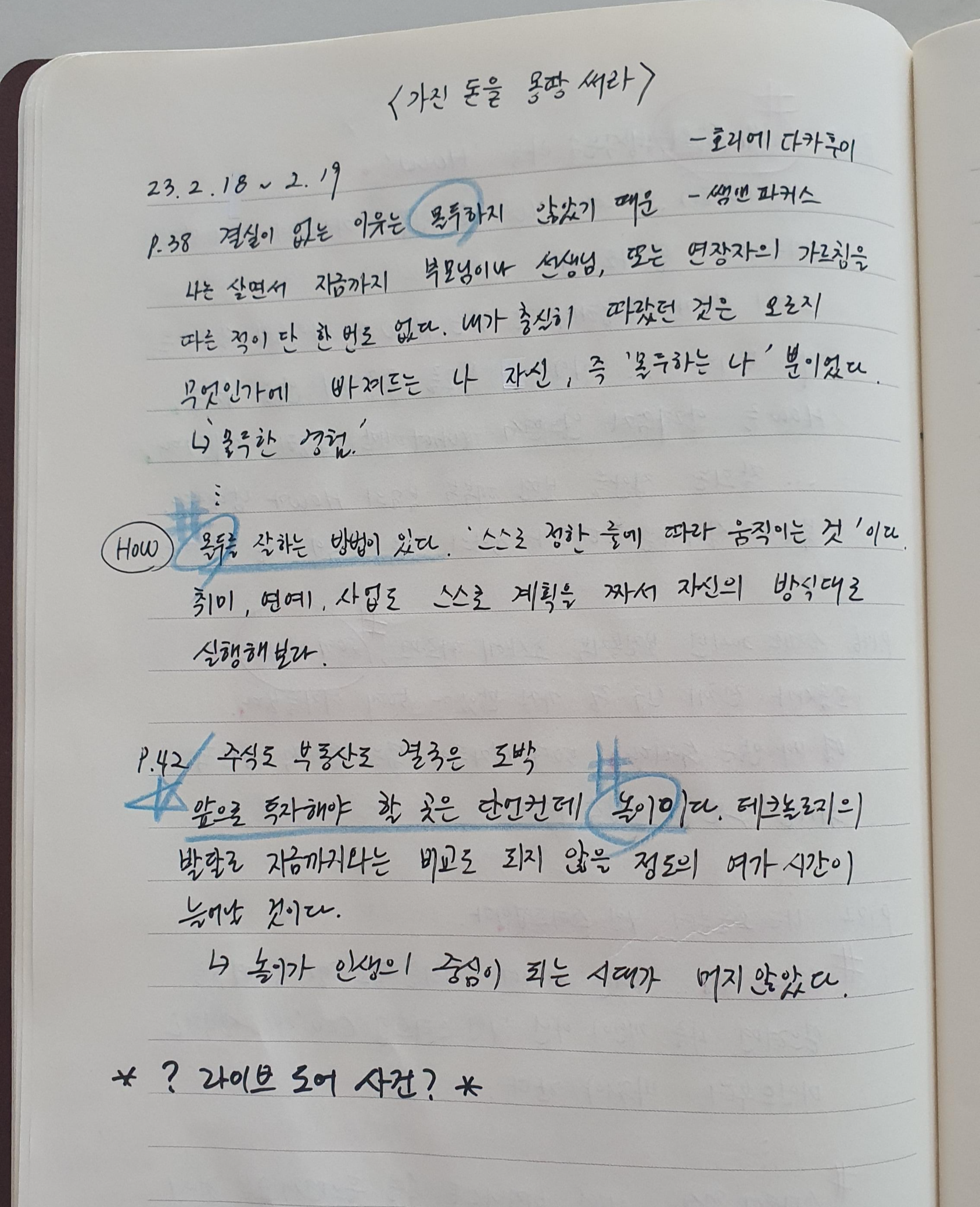 이 책을 선택하게 된 이유)) 유튜브 알고리즘을 통해 유읽남이라는 채널을 통해 '스스로 감옥에 들어간 천재 사업가..!' 라는 제목으로 라이브도어를 운영하였던 호리에 다카후미에 대한 영상을 우연히 보게 되었다. 객관적으로 보았을 때에는 사람들의 기업적인 운영 능력은 증명이 안되었지만 이리저리 사람들의 이목을 끄는 행동을 통해 유명해지게 되었는데 결국 라이브도어 사건을 통해 주가 조작이 확인되어 구속된 사건이었다. 다른 무엇보다 이 사람은 감옥에서도 책을 쓰는 등 자신의 돈벌이를 위해 활동하였는데 이 책이 젊은 사람들 사이에서 큰 반향을 일으켜 구입하는 사람이 많았다는 것이 신기하였다. 밀리의 서재에 책이 있어 119 페이지 정도로 얇은 책이라 가볍게 읽어 본다.