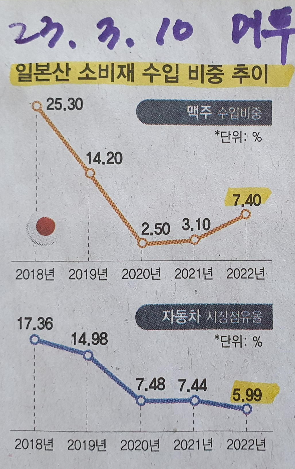 Comment)) 2018년 한국과 일본의 관계가 맥주와 자동차의 경우 우호적인 상황이였다면 NONO japan 이후 1/3 으로 줄어든 상황에서 한-일 관계가 차츰나아지며 2022년 부터 좋아지는 상황이다.