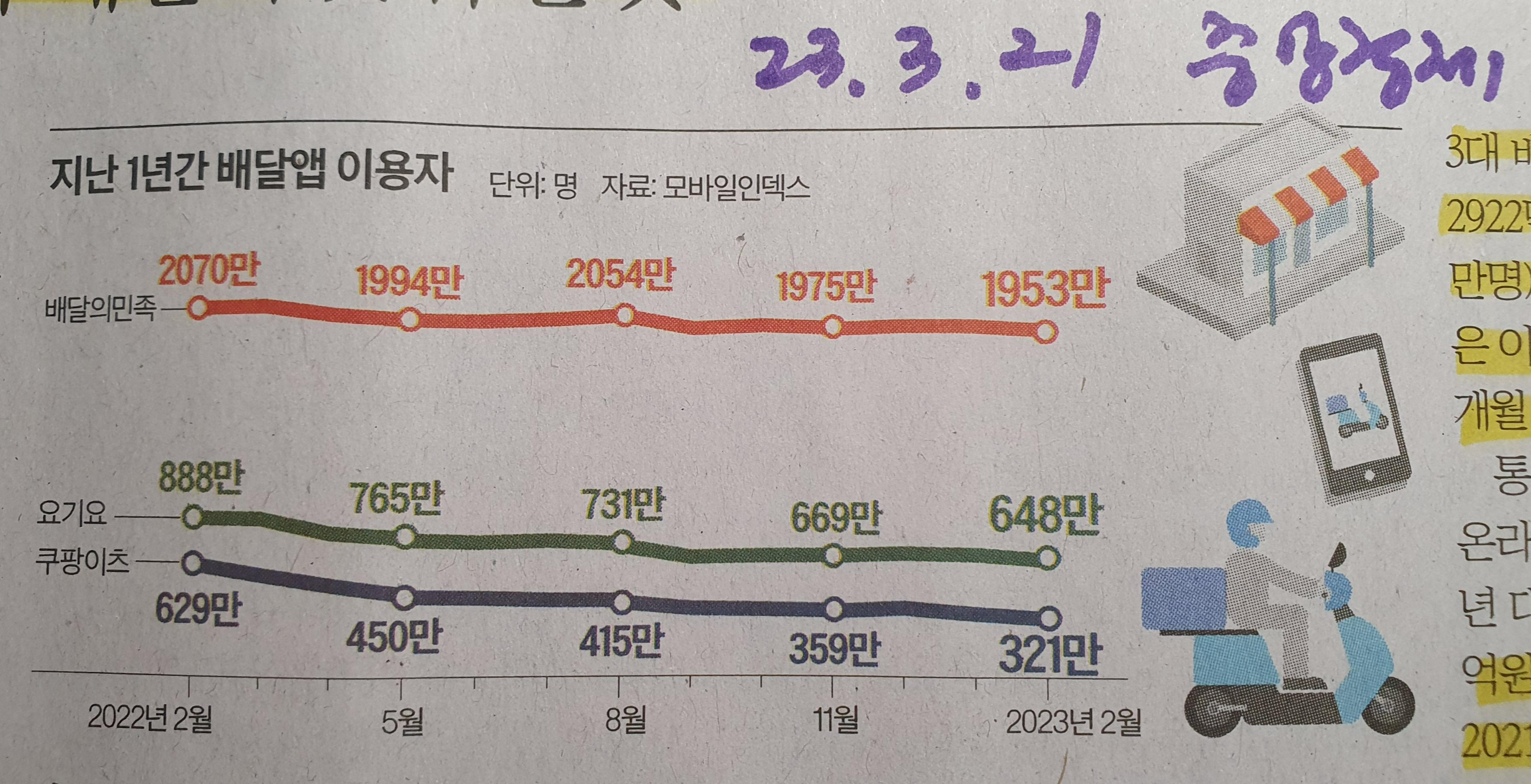 위드 코로나 이후 배달앱 사용자 감소 23.3.21 중앙