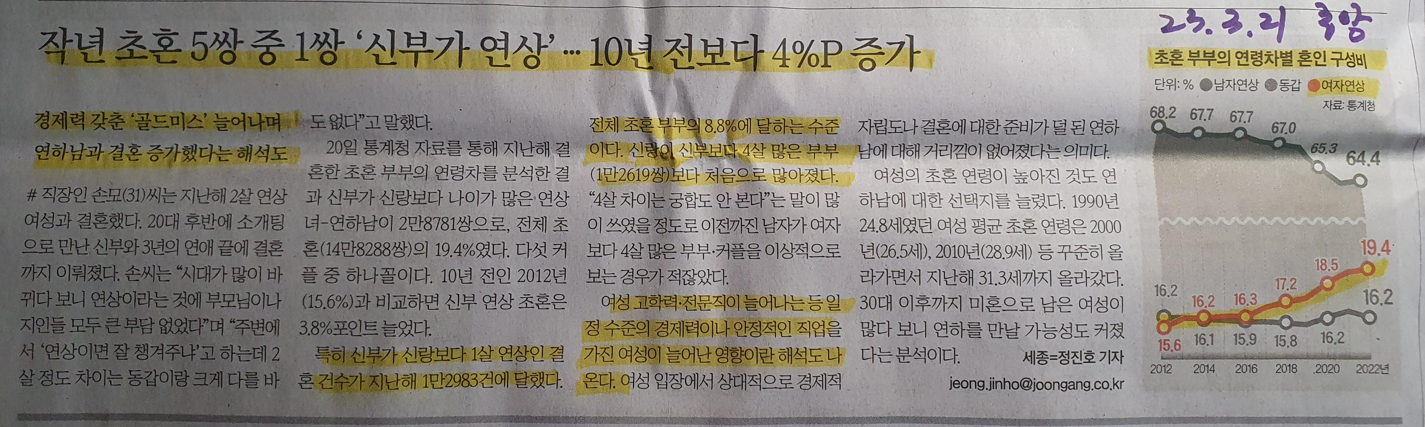 Comment)) 연상연하가 이제는 낯설지 않은 시대이다. 결혼의 전체적인 숫자는 줄어들고 있다는 것이 큰 아쉬운 부분.. 물론 결혼해 보니 정말 부부가 살아가는 것은 경제적으로 큰 장점이지만 아이를 낳고 양육하고 기른다는 것은 큰 경제적 비용이 발생되는 것은 확실하다 생각된다. 그래서 결혼은 힘들어지고...