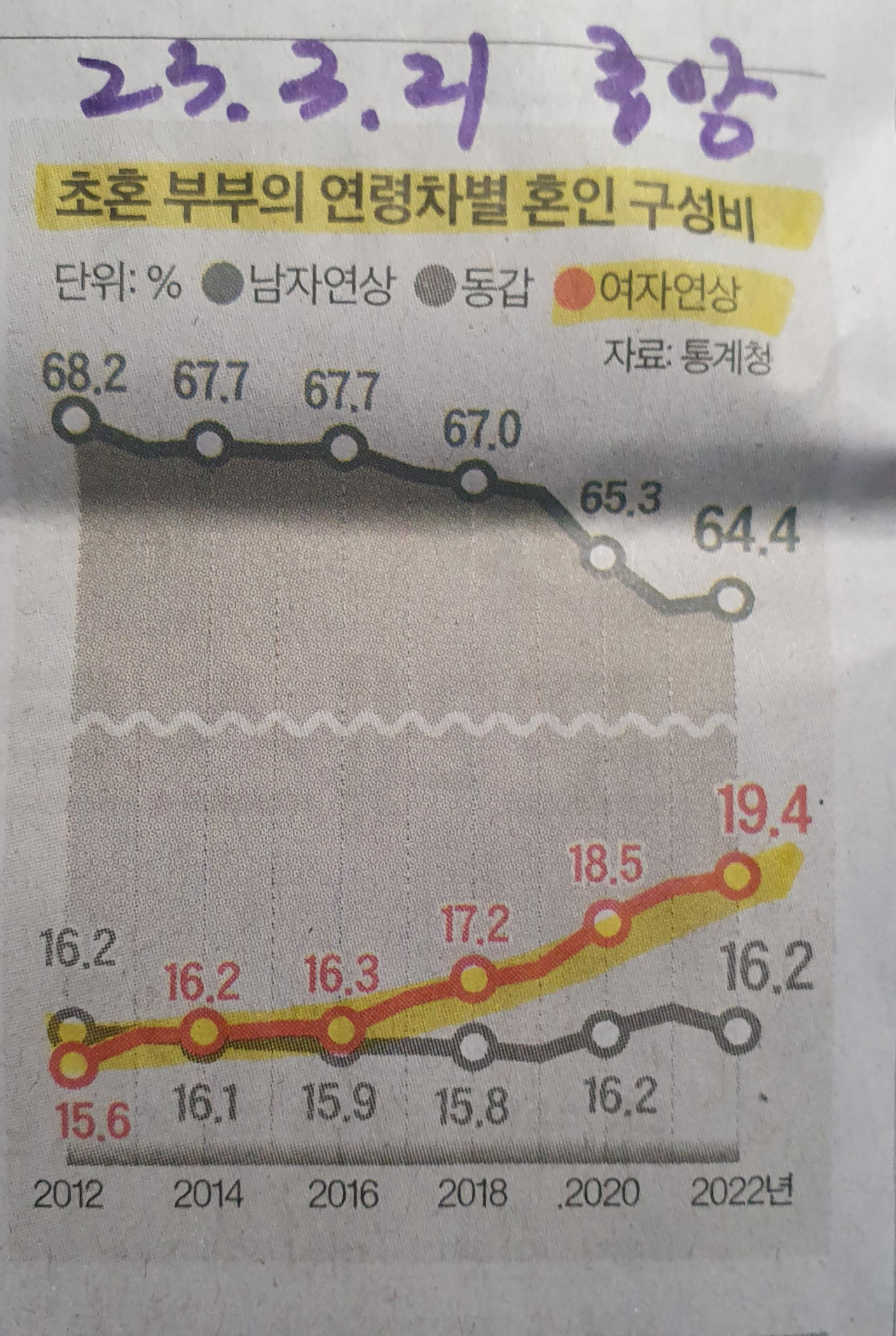 여자연상 남자연하 혼인의 증가세, 초혼 부부의 연령차별 혼인 구성비 23.3.21 중앙