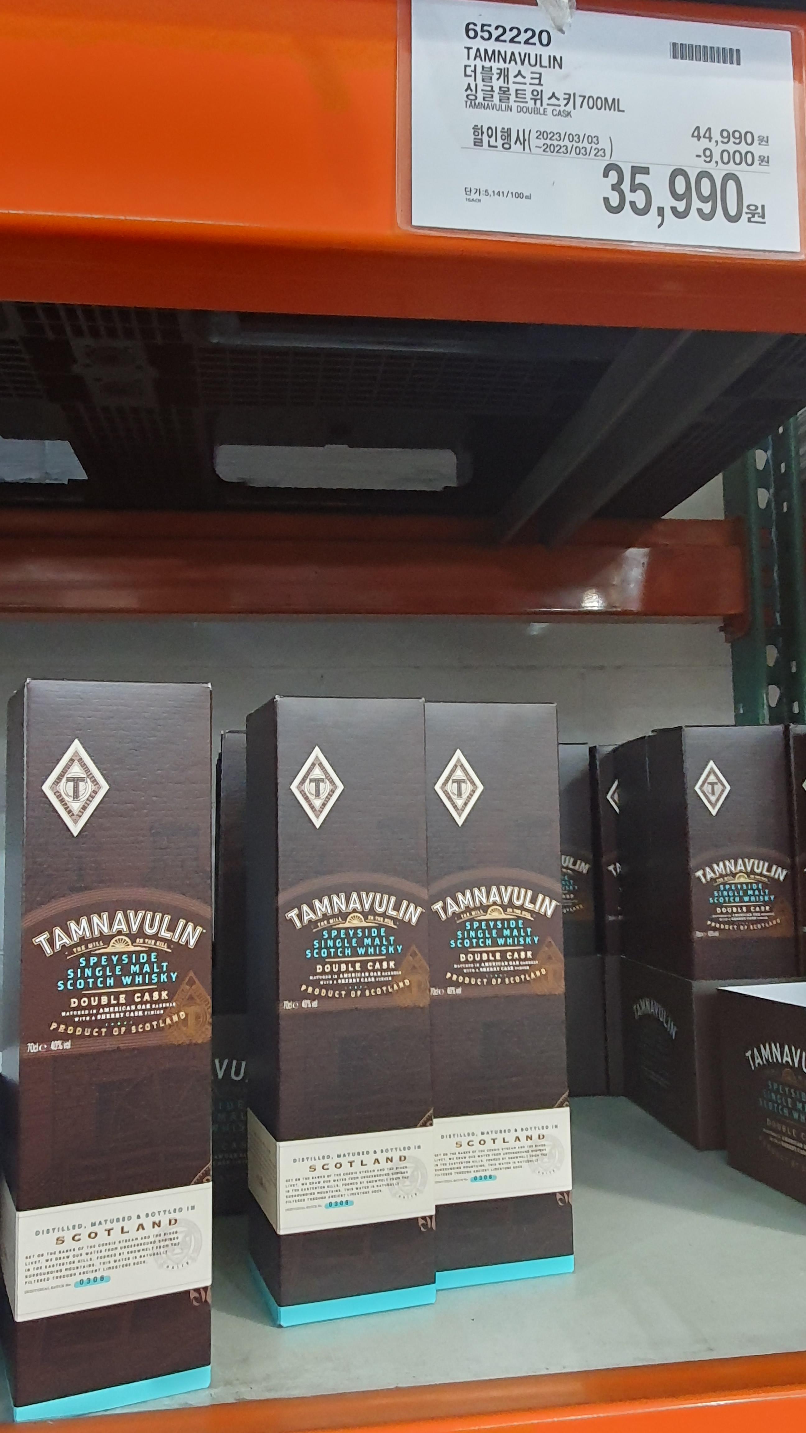 현재 코스트코 주류 중에서 가장 추천하는 것은 탐나불린 더블캐스크 싱글몰트위스키 입니다. 코스트코 갔을때 너무 매력적인 가격이기에 바로 픽업해서 집으로 데리고 왔습니다. 가격은 44,900원도 괜찮은 가격인데 할인행사로 9000원 할인하여 35,990원으로 판매중인 싱글몰트위스키 입니다. 마트에서 주류 가격를 매번 체크하는데 탐나불린은 대부분의 대형마트에서는 4만원 후반에서 5만원 초반대의 가격으로 판매하고 있기에 시중 가격보다 30%싼 가격에 구입할 수 있는 기회는 크게 없기에 방문하시면 꼭 구입하시길 추천해 드립니다.
