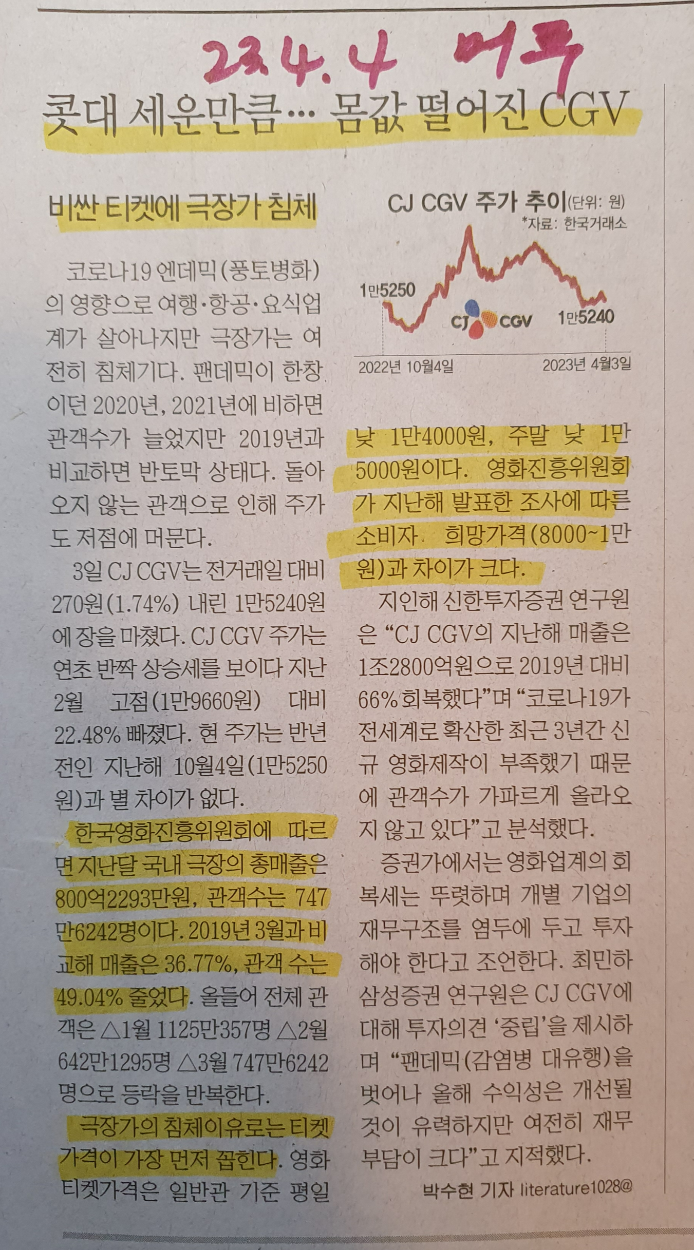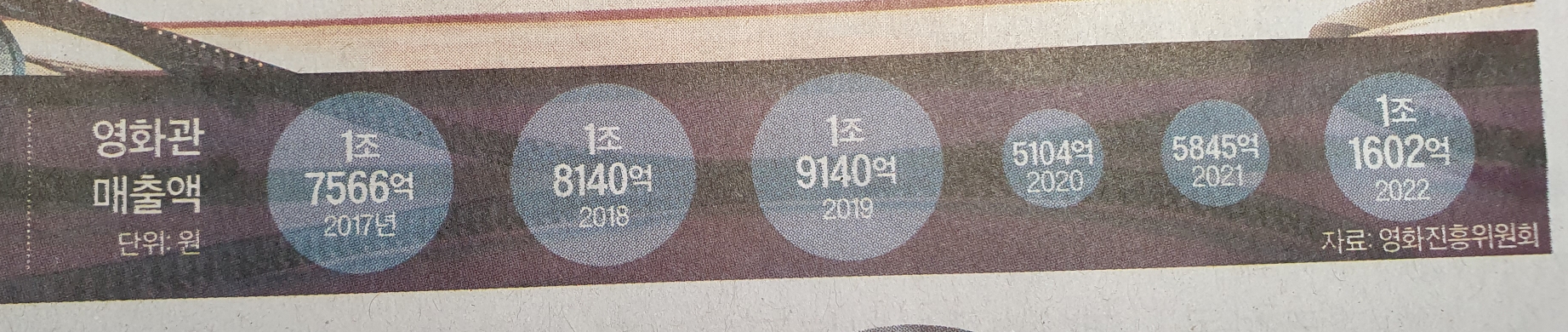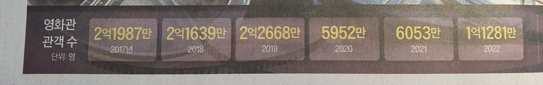 -코로나가 종식되는 시점에서 극장의 관객수가 늘어날 것이라 생각되었지만 실제는 4년 전 대비 매출은 36프로, 관객수는 49프로 줄었다. 단순히 관객의 숫자만 해도 4년 전의 절반으로 반토막 난 것이다.