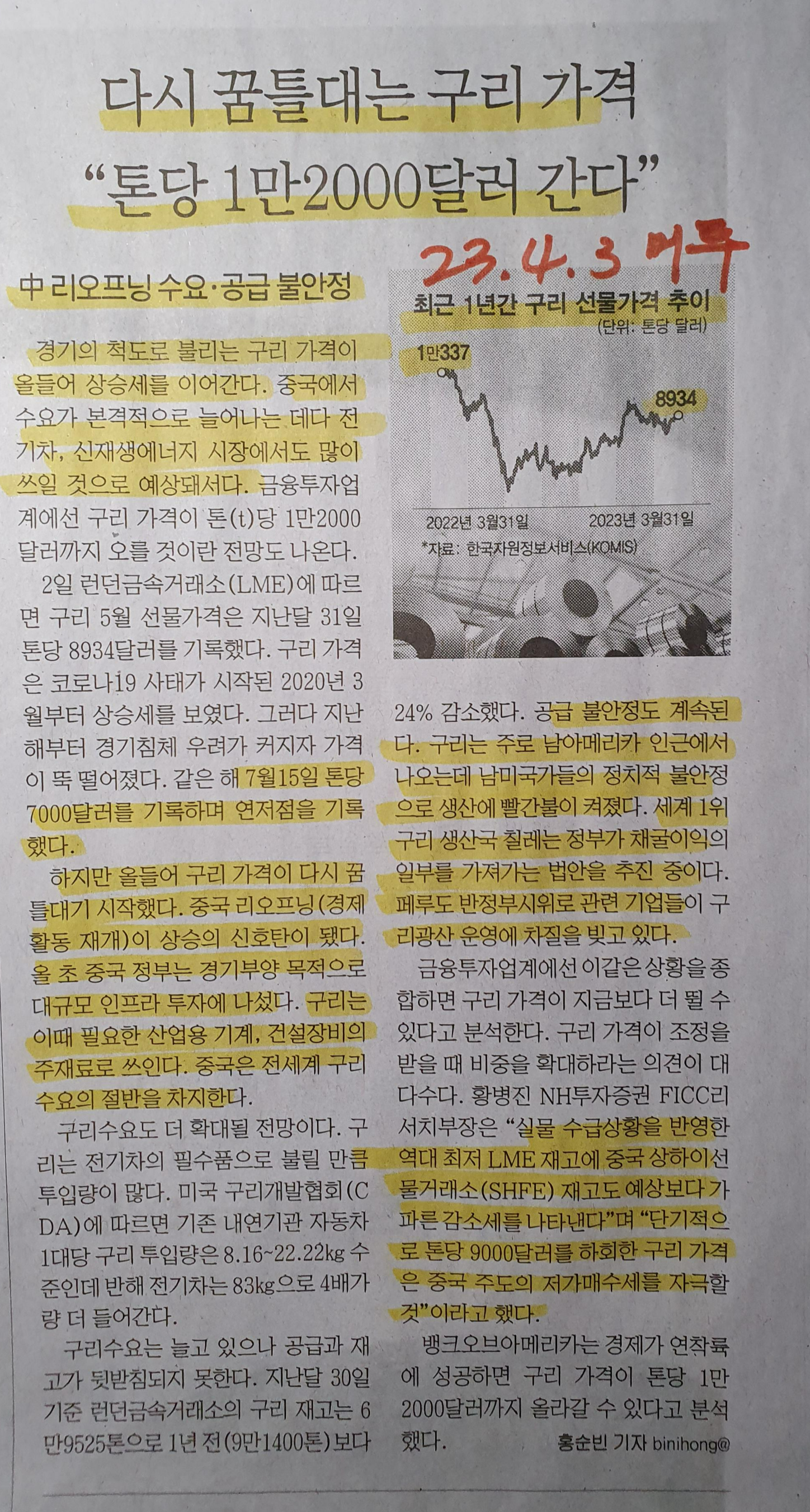 구리 선물가격 추이, 다시 올라가기 시작하는 구리 가격 23.4.3 머투