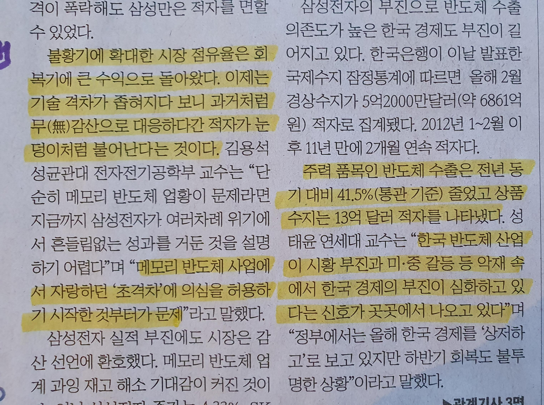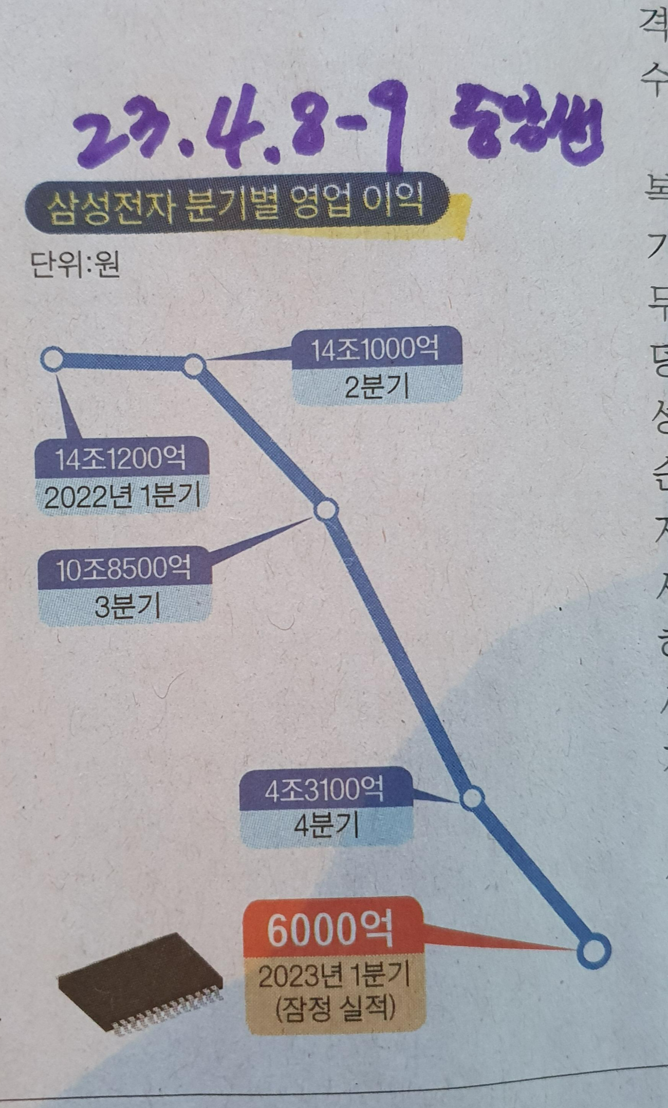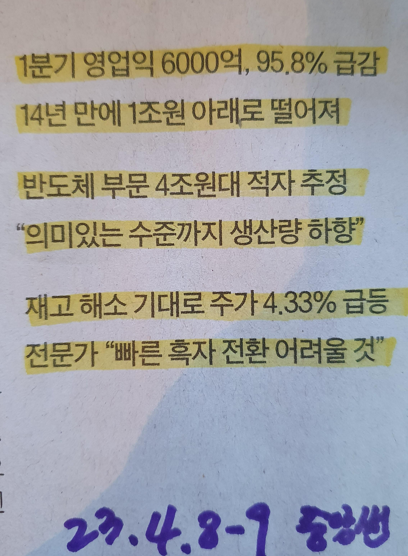 삼성전자 분기별 영업이익 14년만에 1조원 밑으로 떨어지다. 23.4.8~9 중앙썬