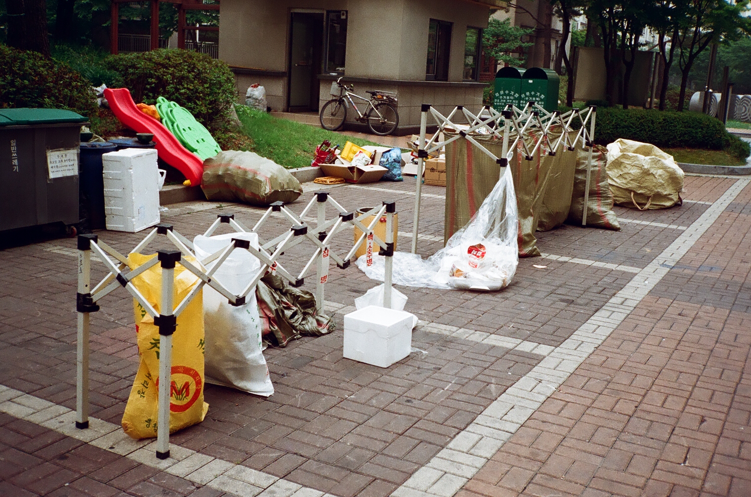 즐거운 쓰레기 분리수거와 투투치킨 배달 오토바이. 주말이여서인지 배달용 오토바이가 아파트네 많았다.