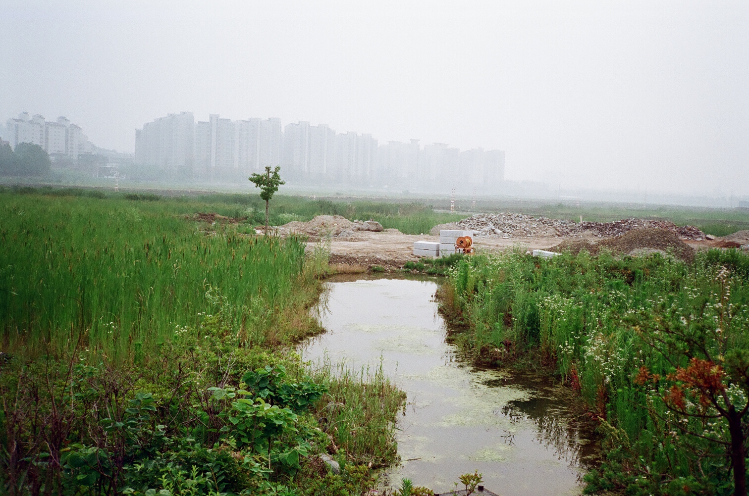 시야에서 보이는 아파트는 외발산동 지역의 아파트로 생각된다. 땅은 파헤쳤으나 개발없이 시간이 지난 넓은 초야 같은 풍경이다. 공사 자제와 흑더미, 무성한 풀, 고여진 물. 살짝 세기말적 느낌이 나는 사진.