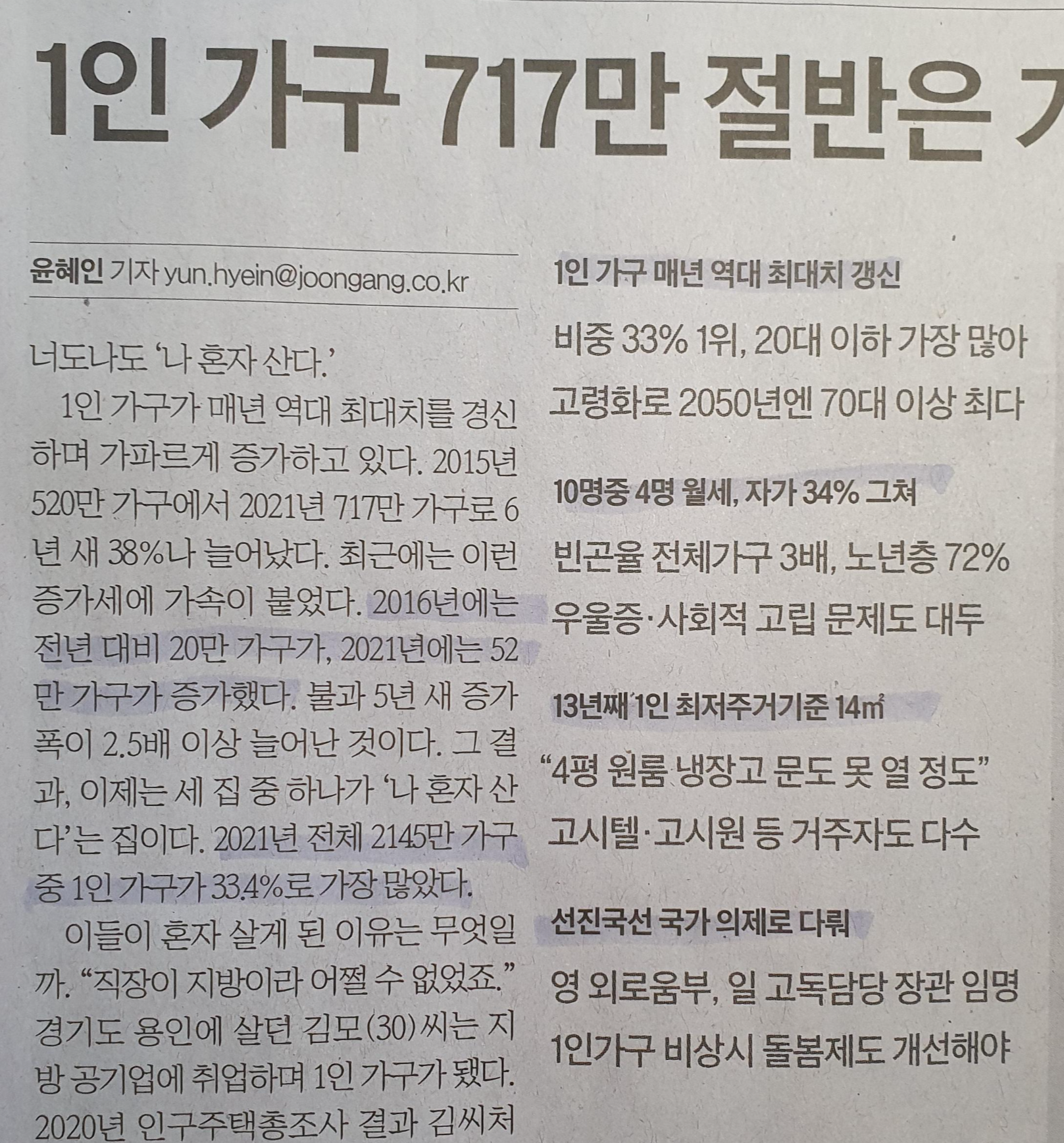 개인 사견으로 3인가구 까지는 선택적인 부분이라 생각된다. 육아의 기쁨을 제외하고 현실적인 육아와 시간과 비용은 큰 리스크로 다가오지만 결혼 후, 2인 가구는 중년과 노년 생존을 위해서도 나쁘지 않은 선택이라 생각된다. 물론 1인으로 살면서도 철저히 노년을 준비하고 본인이 하고 싶은 삶을 사는 것 또한 큰 의미가 있는 인생이라 생각한다. 각자도생, 결국은 자기 인생은 자기가 책임지고 사는 부분이니 말이다.