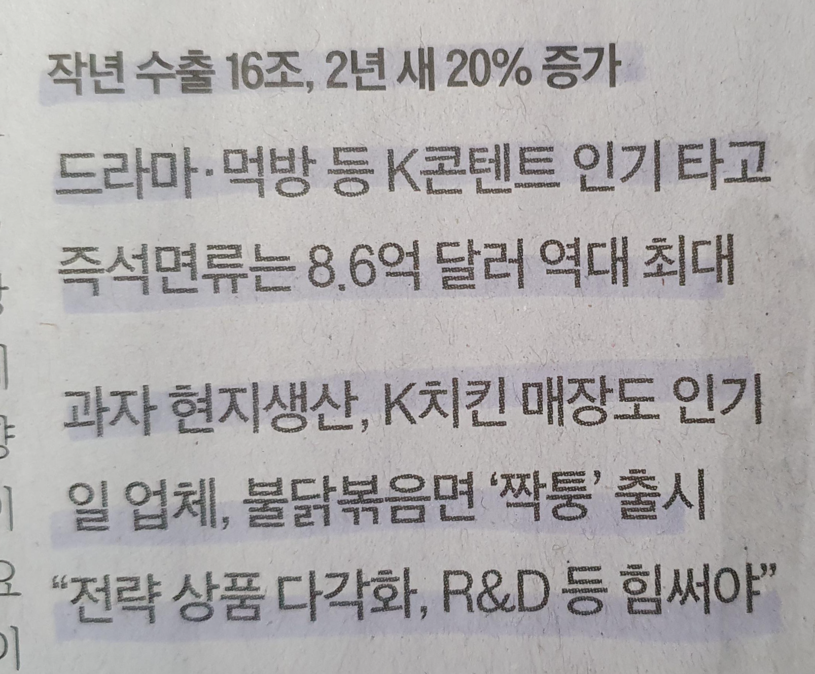 -작년 식품류 수출 16조, 2년새 20프로 증가세, 특히 라면과 같은 면류의 반응이 아주 높은편
