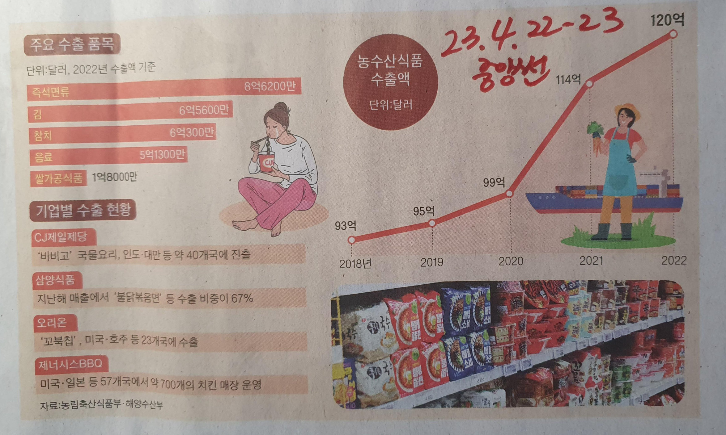 대한민국 식품류 수출, 농수산 식품 수출, K푸드의 상승세 23.4.22-23 중앙