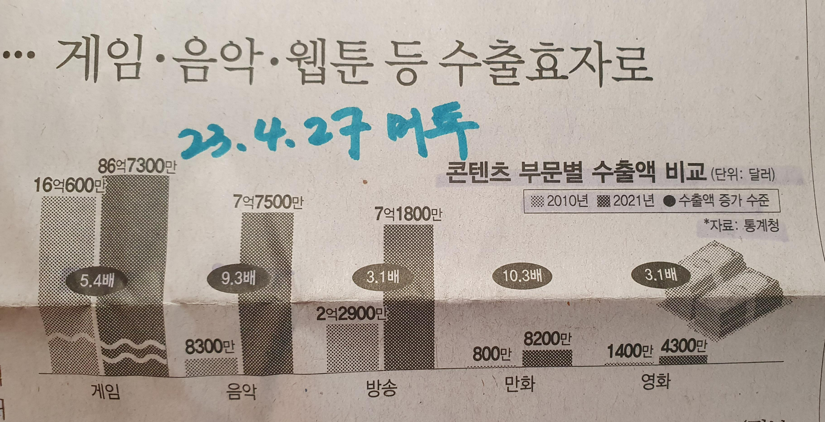 Comment)) 신문을 보던 중, 대한민국의 콘텐츠별 수출액을 비교하는 표가 보여 스크랩한다.
